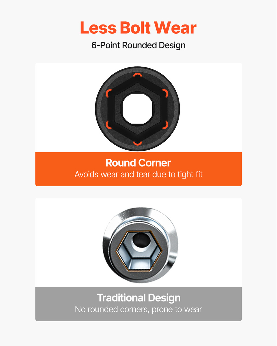 ?SUPERIOR PERFORMANCE?- Whether you drive them with an impact wrench or by hand, these premium chrome vanadium sockets deliver superior performance. The impact socket set features a 6-point, high-torque design that contacts and grips the stronger flat sides of nut or bolt head, not the weaker corners.