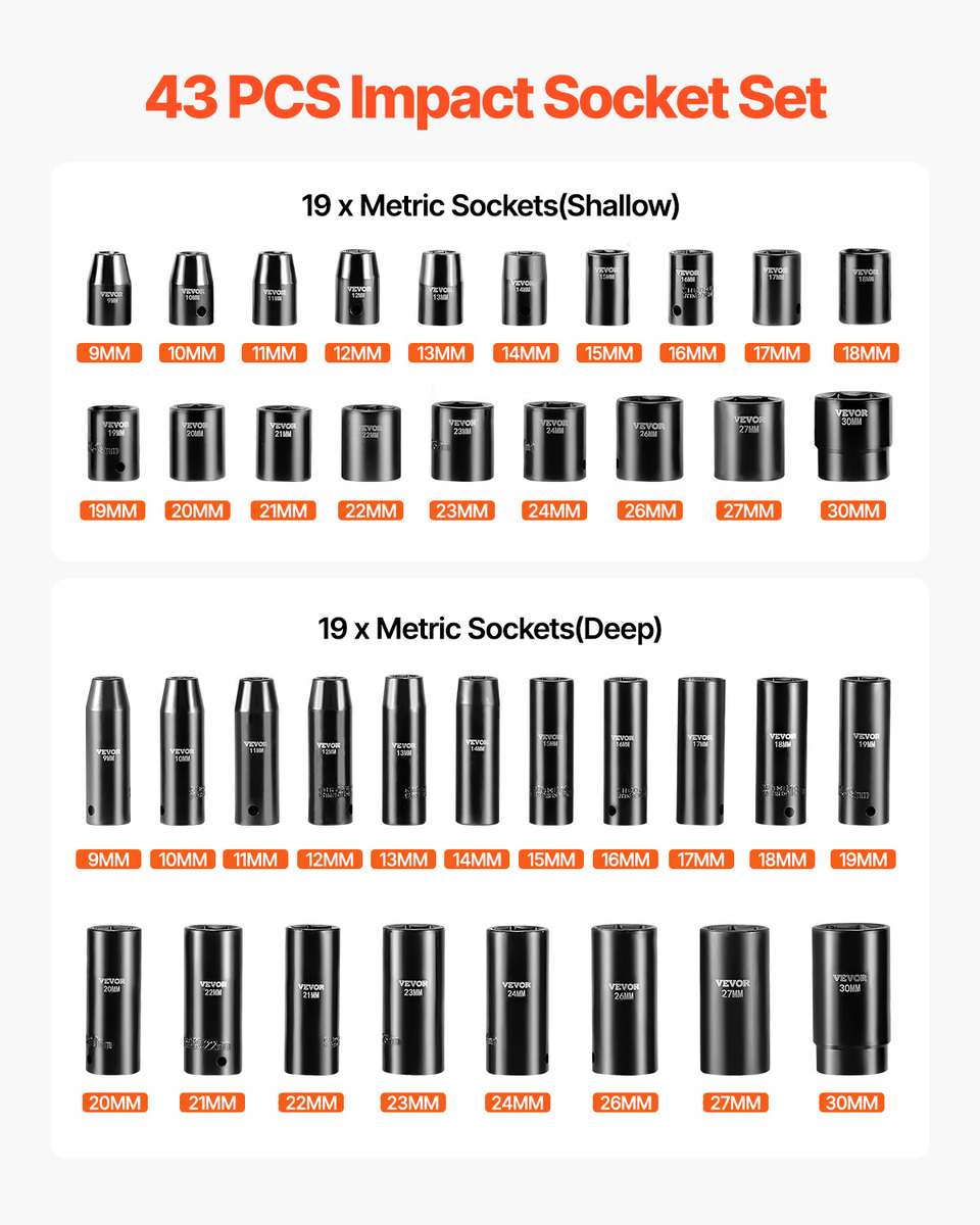 ?38 SOCKETS INCLUDED?- This effort-saving 1/2 inches drive impact socket set comes with 19 standard sockets: 9mm, 10mm, 11mm, 12mm, 13mm, 14mm, 15mm, 16mm, 17mm, 18mm, 19mm, 20mm, 21mm, 22mm, 23mm, 24mm, 26mm, 27mm, 30mm, 19 deep sockets: 9mm, 10mm, 11mm, 12mm, 13mm, 14mm, 15mm, 16mm, 17mm, 18mm, 19mm, 20mm, 21mm, 22mm, 23mm, 24mm, 26mm, 27mm, 30mm and 4 extension bars: 3'', 5'', 10'', 15''.