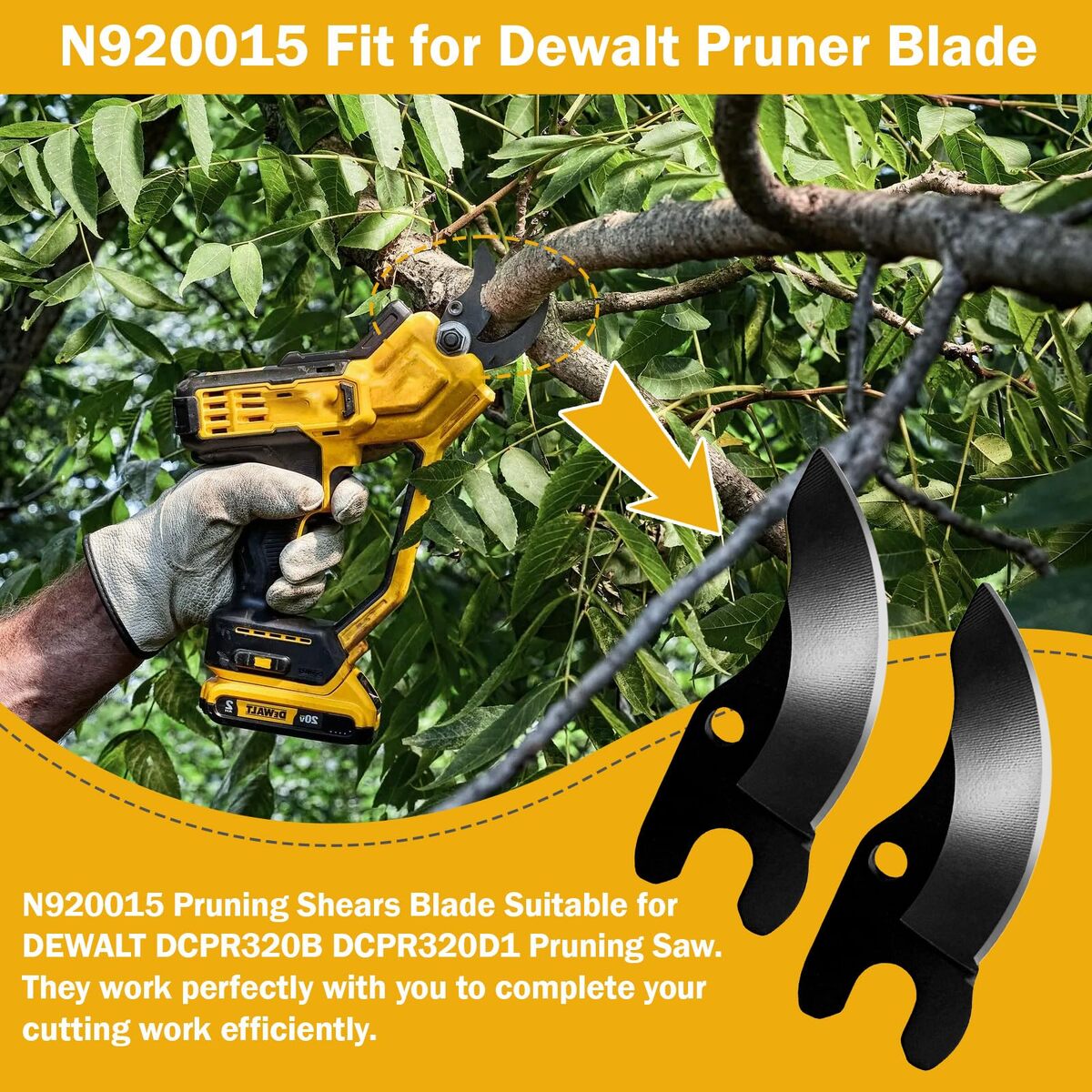 DURABLE MATERIAL: N920015 Pruner Blade Fit for DEWALT DCPR320B, DCPR320D1 Pruning Saws. The pruner blades are made of high carbon steel material with higher hardness and good toughness, which ensures that the blades can withstand heavy-duty use without being quickly deformed or blunted.