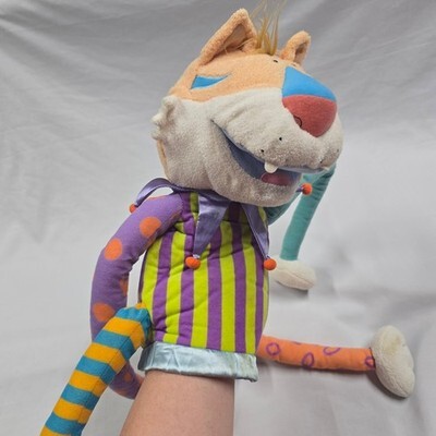 Keywords: plush toy, puppet, jester, clown, cat, stuffed animal, collectible, whimsical, colorful, childrens toy, novelty, hand puppet