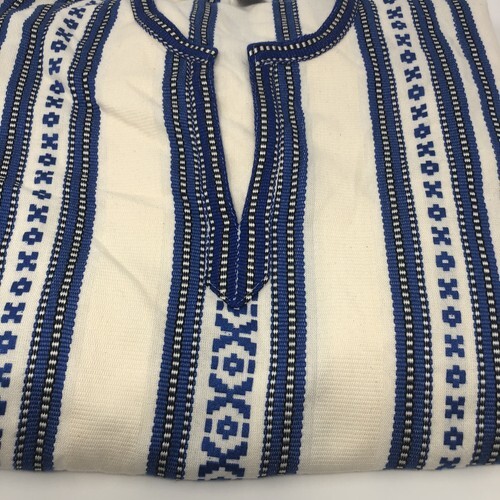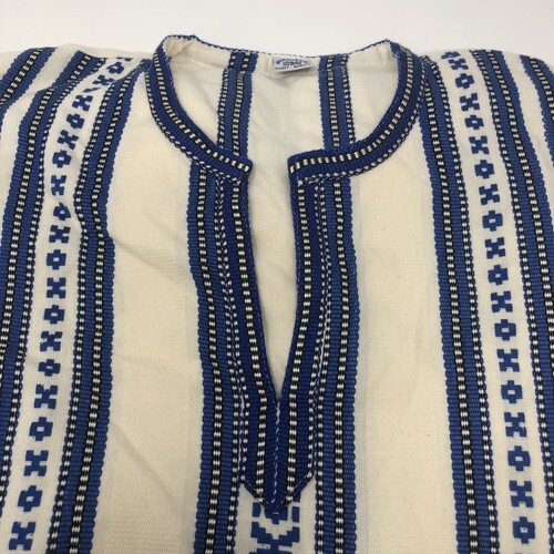 This Vintage 70s Greek Caftan Dress in Beige Blue is a handmade, one-of-a-kind piece that embodies a bohemian look from the 1970s. Made from a comfortable cotton blend material, this dress features a relaxed fit perfect for everyday wear. With a waist size of 43 inches and a women's size 4, this original Greek caftan is a unique addition to any vintage clothing collection.