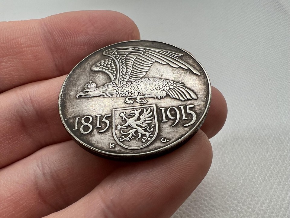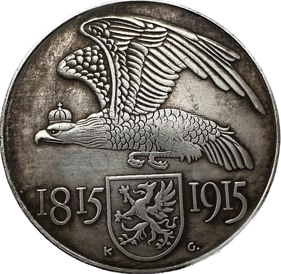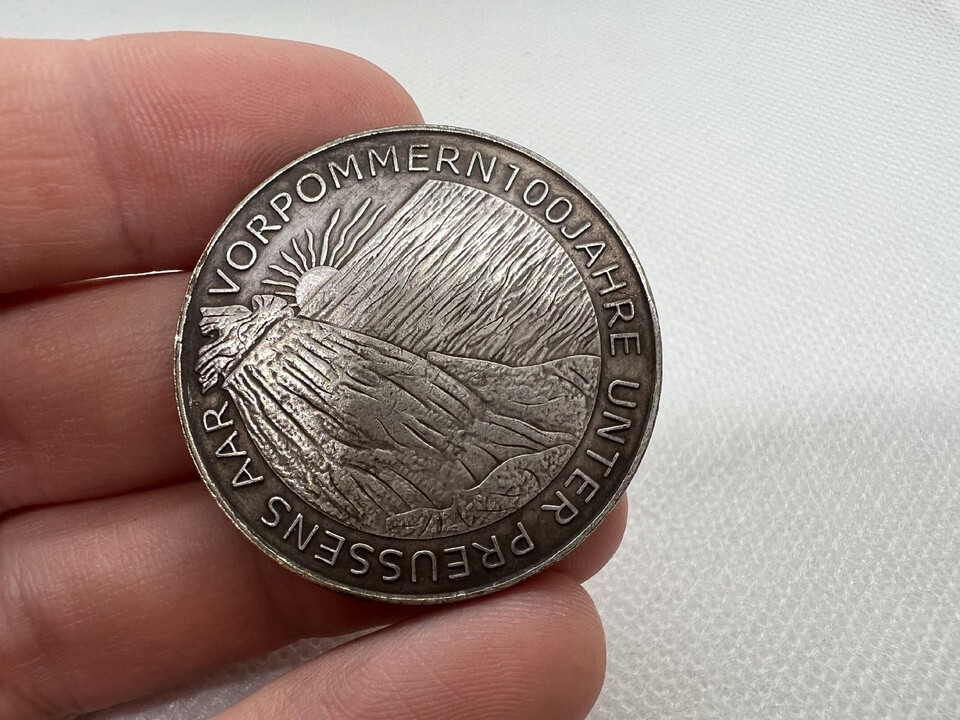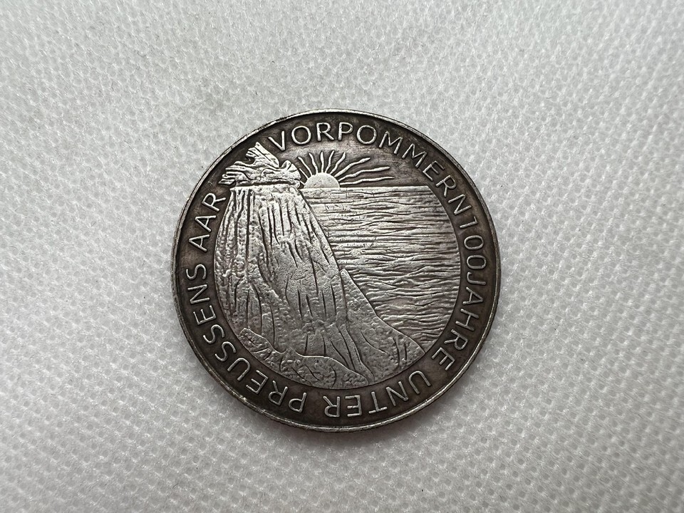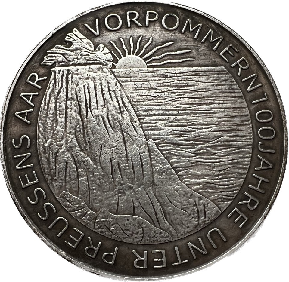 Tato st?íbrna s rokem 1915 oslavuje 100. výro?í p?ipojení Vorpommern k Prusku a byla vydana Verein für Münzfreunde zu Greifswald. Její jedine?ný design, razený znamým ra?ebním um?lcem Karlem Goetzem, ukazuje na jedne stran? majestatního pruskeho orla spojeneho se ?títem griffona, symbolizujícího spojení Vorpommern a Pruska. Na druhe stran? se nachazí skalnate pob?e?í s vychazejícím sluncem, p?ipomínající nový za?atek a svítaní nove ery pro Vorpommern. Tato medaile je dokonalým zt?lesn?ním pruskeho a vorpommerskeho d?dictví a je skv?lým dopl?kem pro ka?deho sb?ratele mincí a medailí.