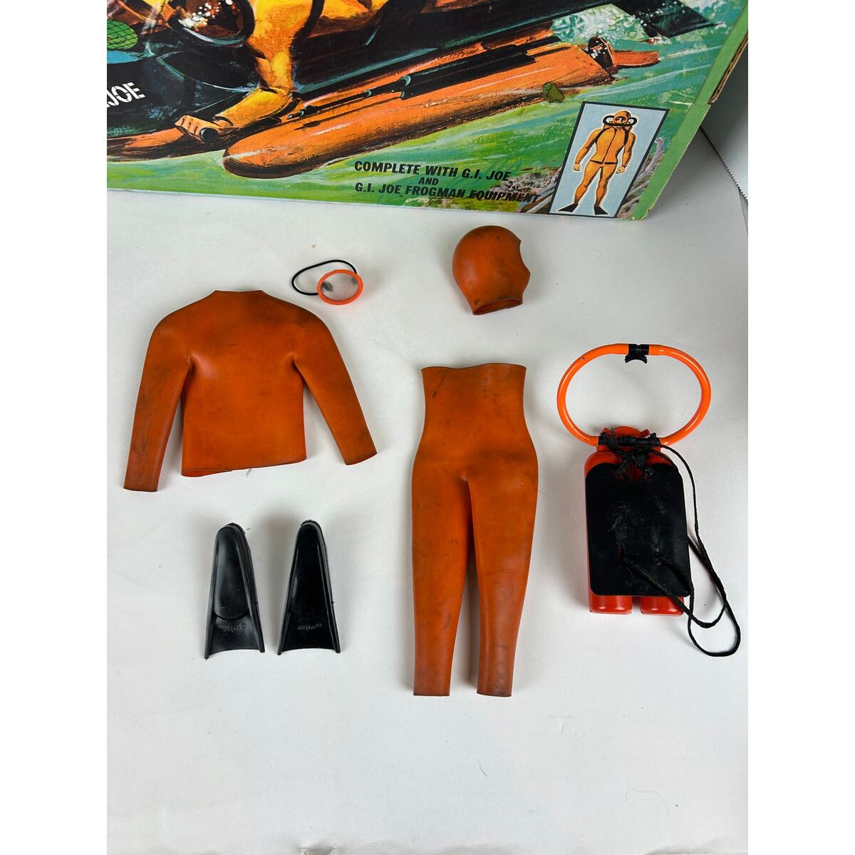 This is a complete vintage G.I. Joe Sea Sled and Frogman set paired with an original 1964 G.I. Joe Action Sailor figure. The Sea Sled?s motor is fully functional, and you can provide a video for buyers. Note: the propeller has a break but still operates under power. The frogman suit?hood, jacket, pants, mask, fins, and tanks?is all present, and the rubber remains soft and flexible, which is rare for age.