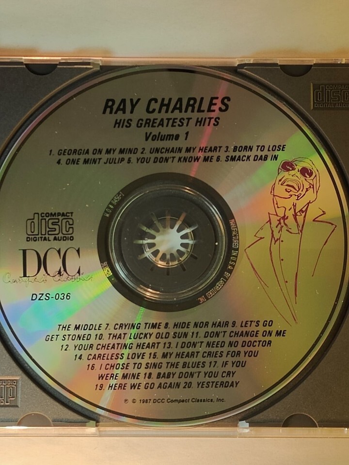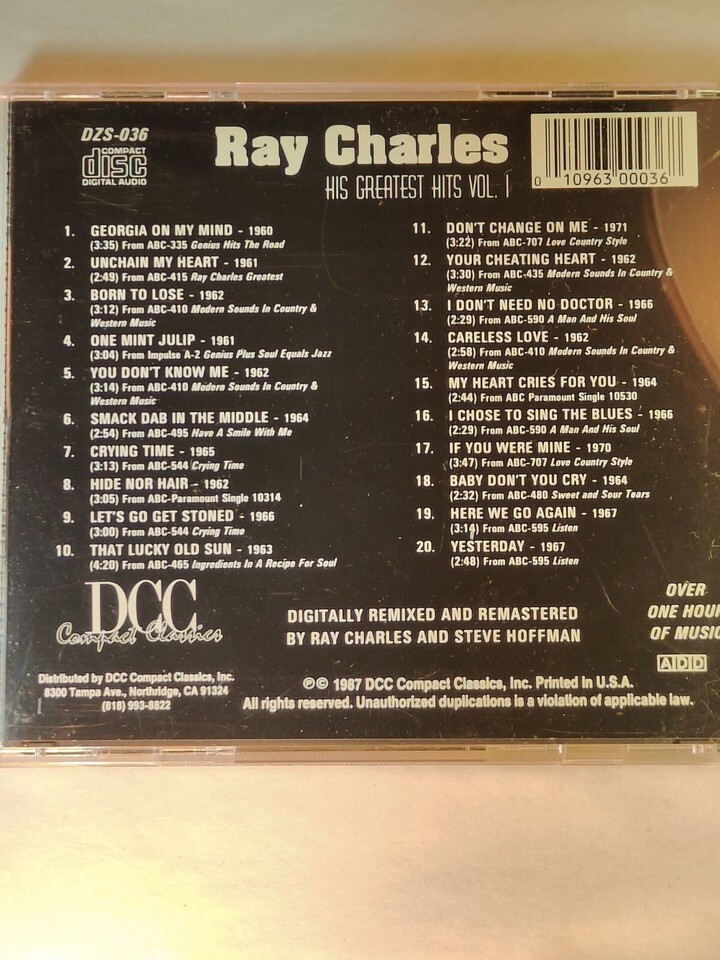 This Ray Charles Greatest Hits Volume 1 CD is a must-have for any R B and Soul music lover. With 20 hit songs, this compact disc is packed with classic R B tunes that will transport you back to the golden age of music. The album was released in 1987 under the DCC record label and comes in a standard jewel case.