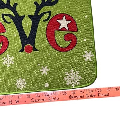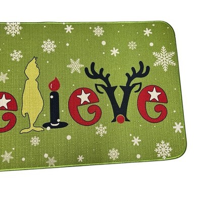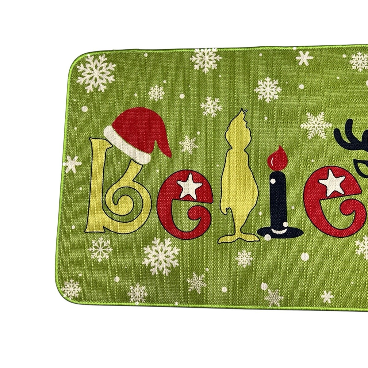 Festive Believe Christmas doormat featuring a Grinch-style silhouette, Santa hat, deer antlers, and snowflakes on a bright green background. Measures approx. 29? x 17?. Perfect for holiday entryways, porches, kitchens, or indoor decor. Durable woven fabric, vibrant colors, and seasonal charm. Great for fans of whimsical Christmas themes. New without tags