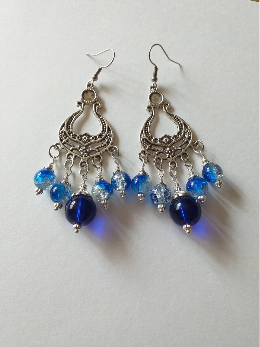 Victorian Blue crackle beads and Cobalt blue large beads and Silver-toned filigree ornaments earrings . Black and silver beautiful earrings Special occasion Blue earrings . Gothic blue earrings.