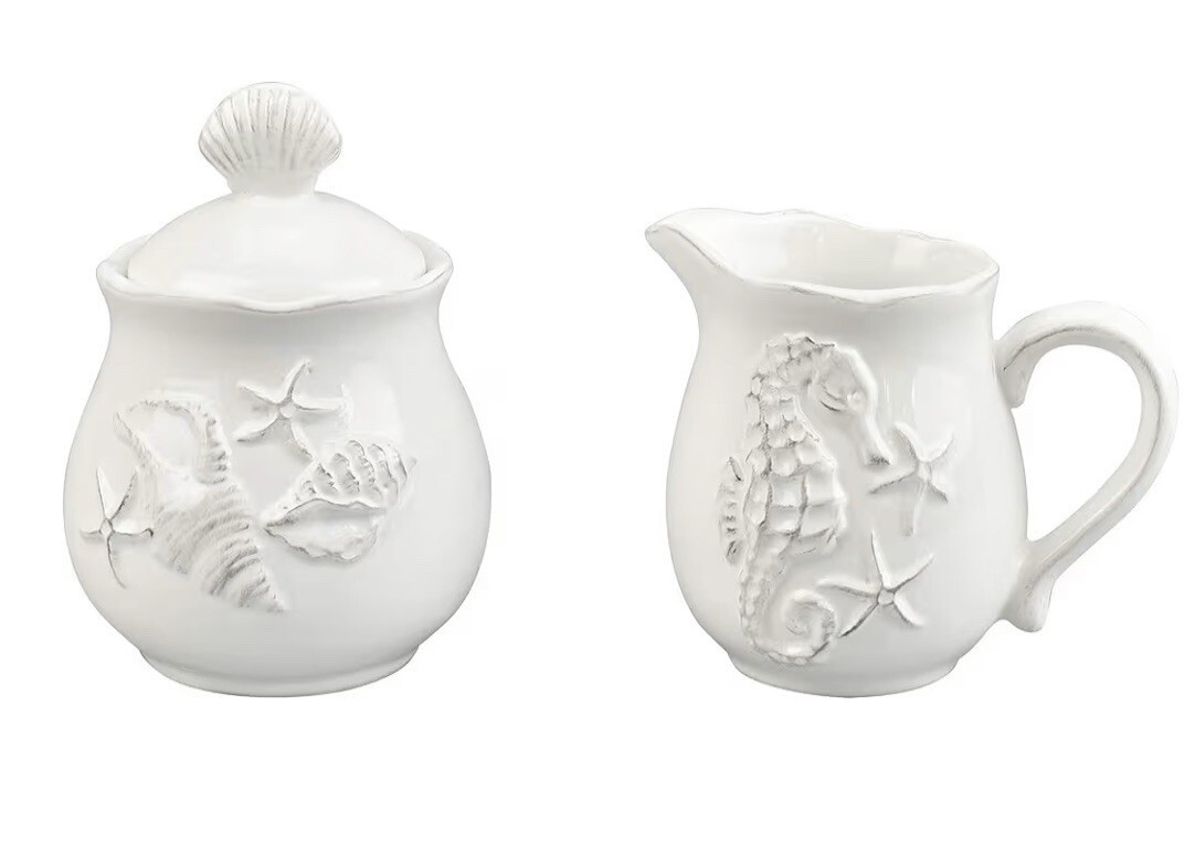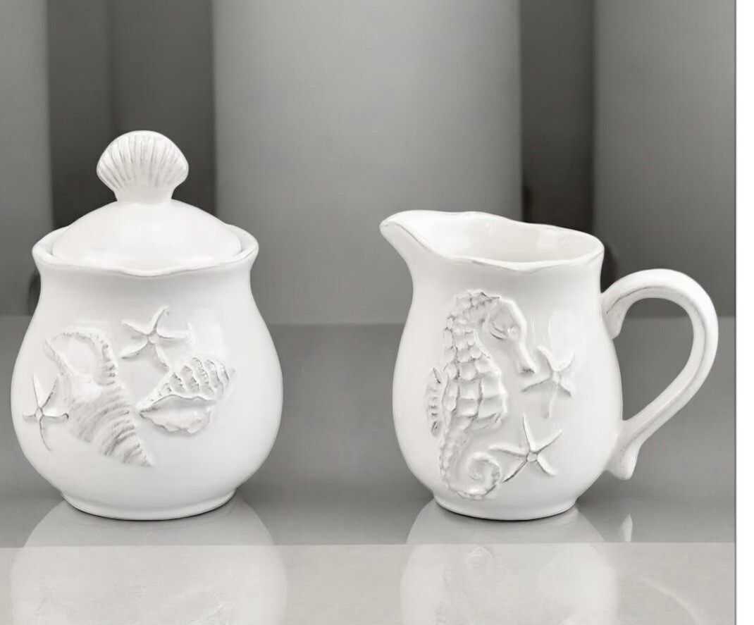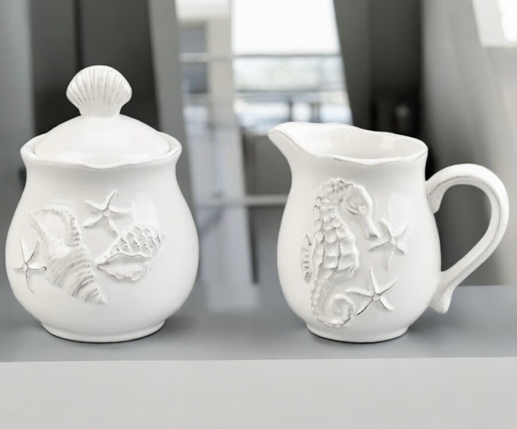 Blue Sky ClayWorks Seahorse Shells Beach Ceramic Creamer And Sugar New - White