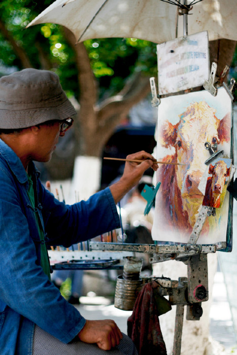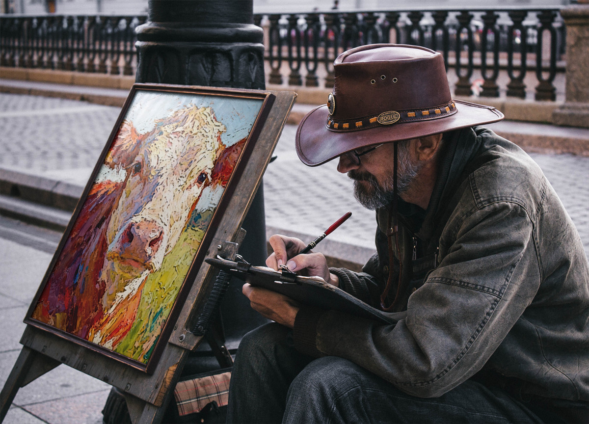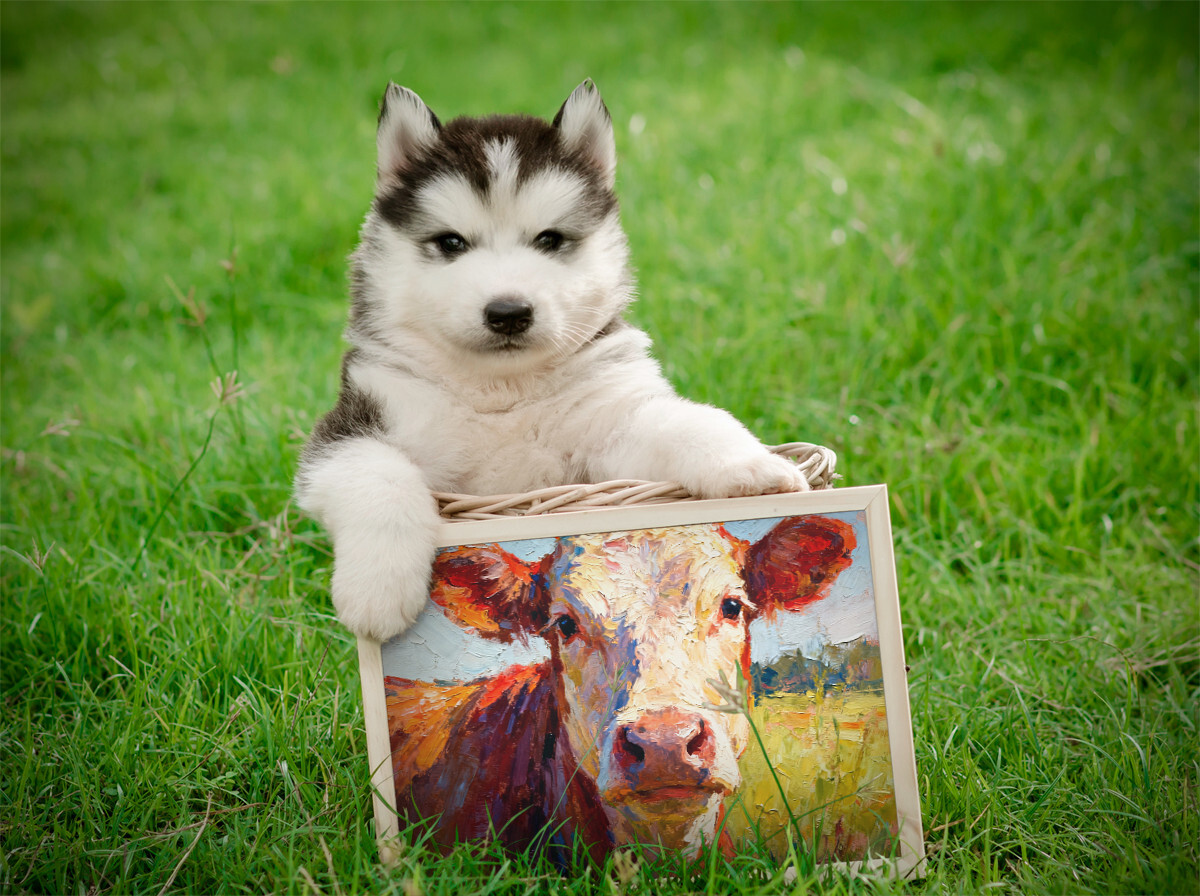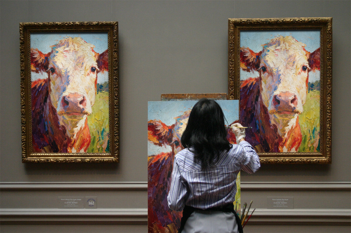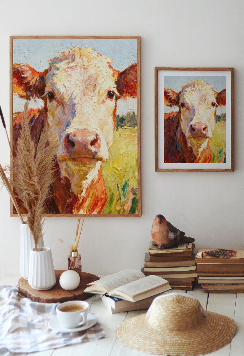 Striking balance of vivid colors and detailed nuances injects joy and positive energy into any space. Every glance reveals new inspiration—whether drawn to the cow’s honest portrait or the lush background supporting it.