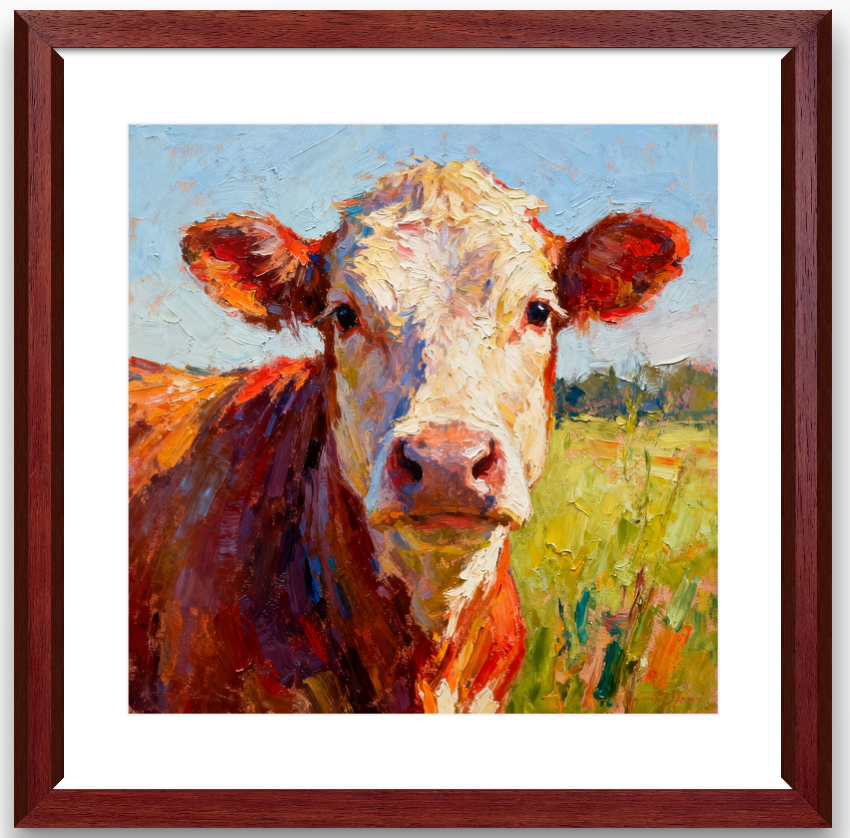 Enjoy a stunning digital artwork with "Radiance of Life" – an oil painting style piece that captures the vibrant energy of countryside sunlight through the expressive gaze of a cow. Each brush stroke infuses the scene with warmth and movement, inviting you to feel the lively spirit of nature.