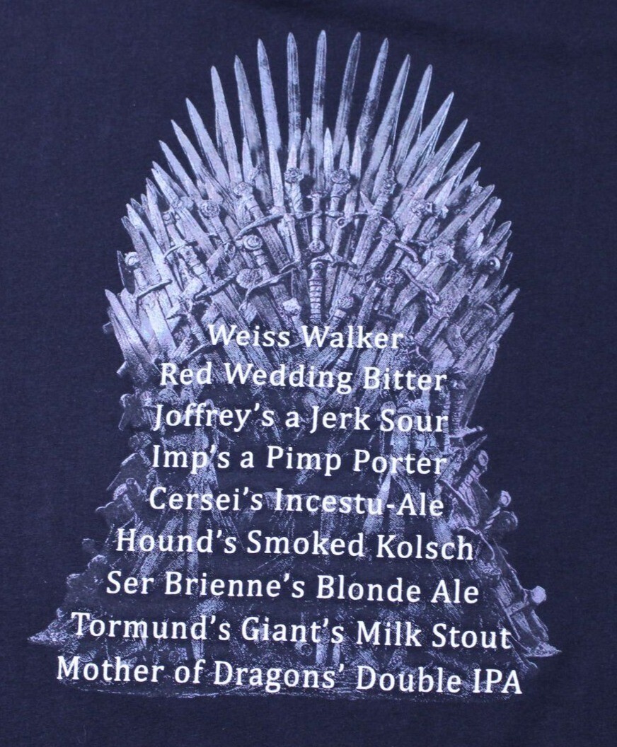 This Iron Throne Brewing t-shirt showcases a captivating blend of style and pop culture with its intricate graphic design. The front proudly displays a detailed emblem, while the back lists cleverly named brews inspired by a beloved fantasy series. Crafted for comfort and longevity, this tee offers a relaxed fit, ideal for casual outings or themed events. The soft cotton fabric ensures breathability, making it a year-round wardrobe staple. Embrace your inner fan while enjoying the comfort of high-quality apparel.