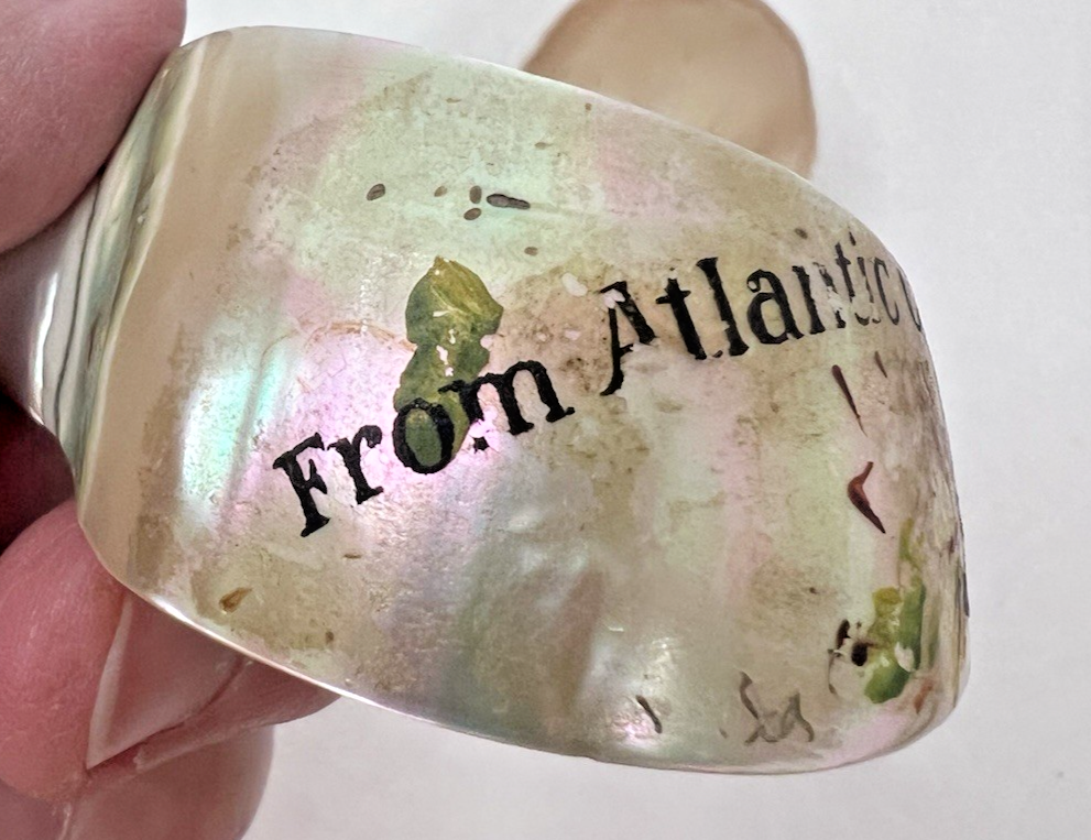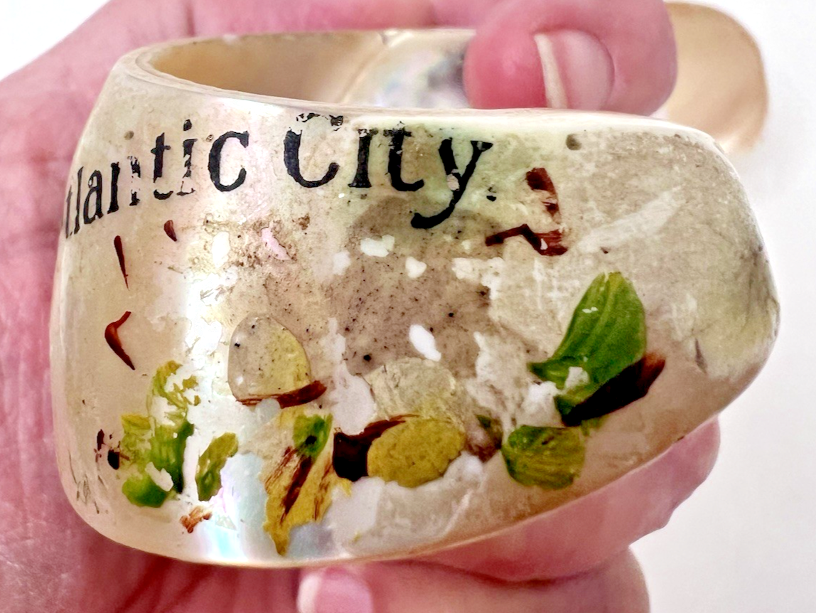 2 Antique Souvenir Real Seashell Napkin Rings From Atlantic City Wear 1 has painted/transfers that are worn the other none they measure about 3 inches long