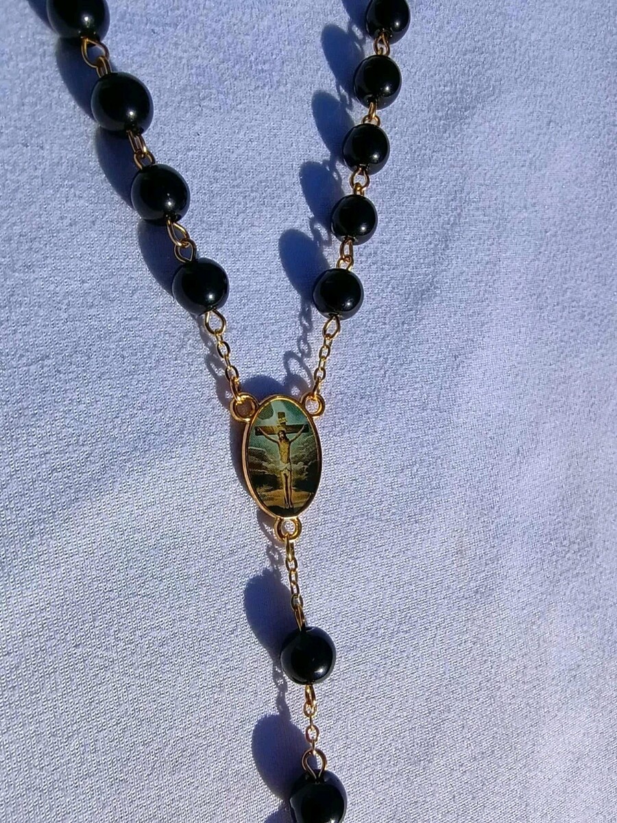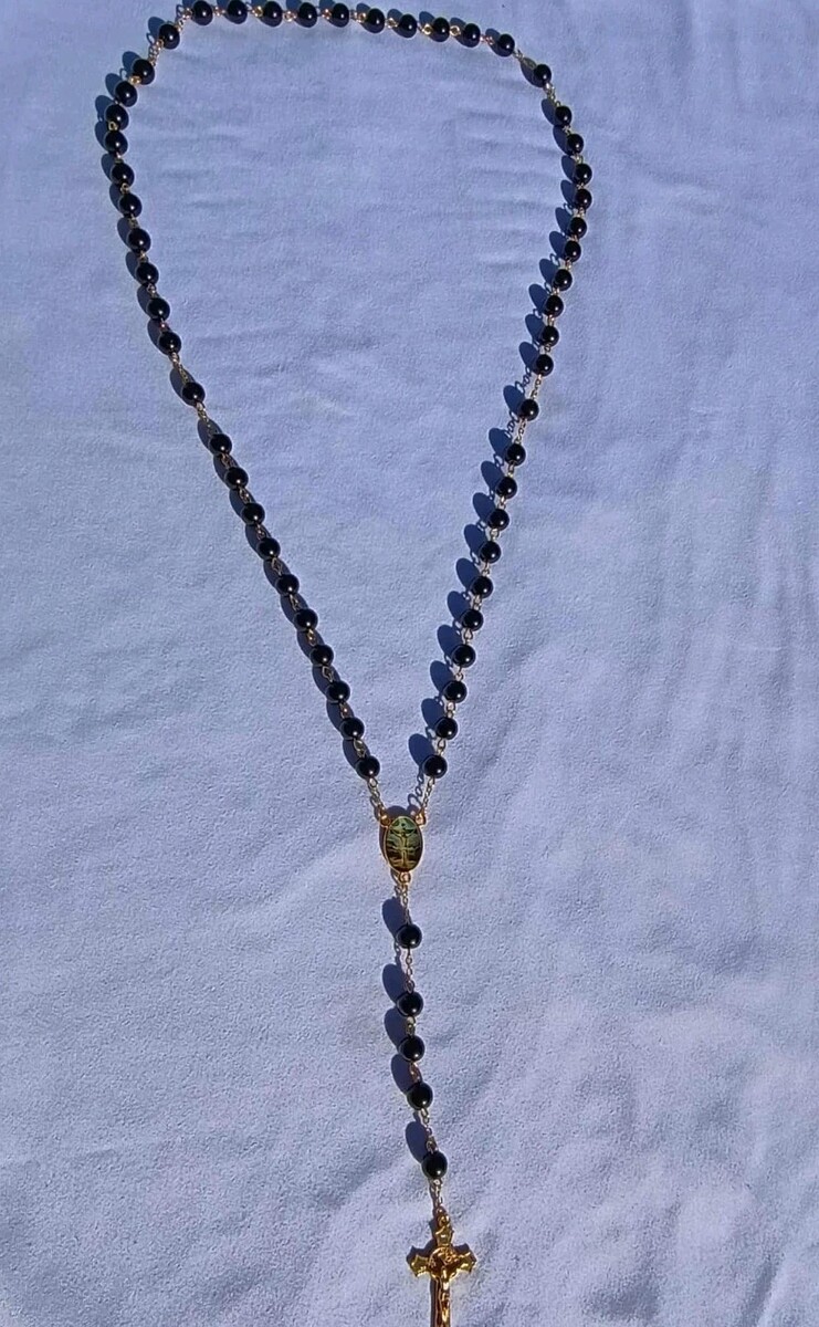 This elegant rosary features glossy 8mm black glass beads hand-linked with gold-tone wire, creating a rich and timeless contrast. The deep ebony beads pair beautifully with the ornate gold crucifix and the Holy Family centerpiece, giving this rosary a strong, classic, and reverent look. Perfect for prayer, devotion, or gifting.
