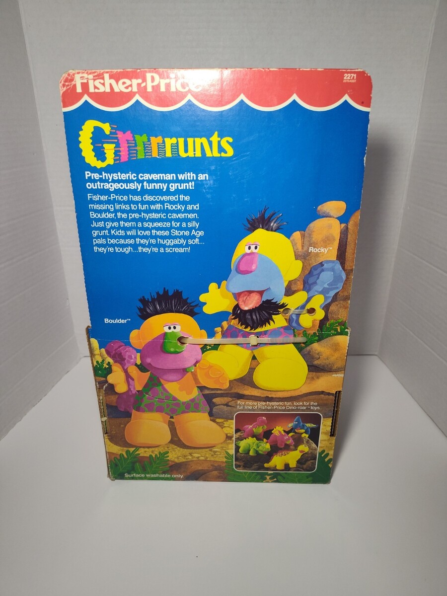 The Grrrrunts line was a short-lived mid-80s Fisher-Price series with only two characters produced, making boxed examples scarce (ROCKY Is SUPER RARE in a box) and especially complete with the club accessory.