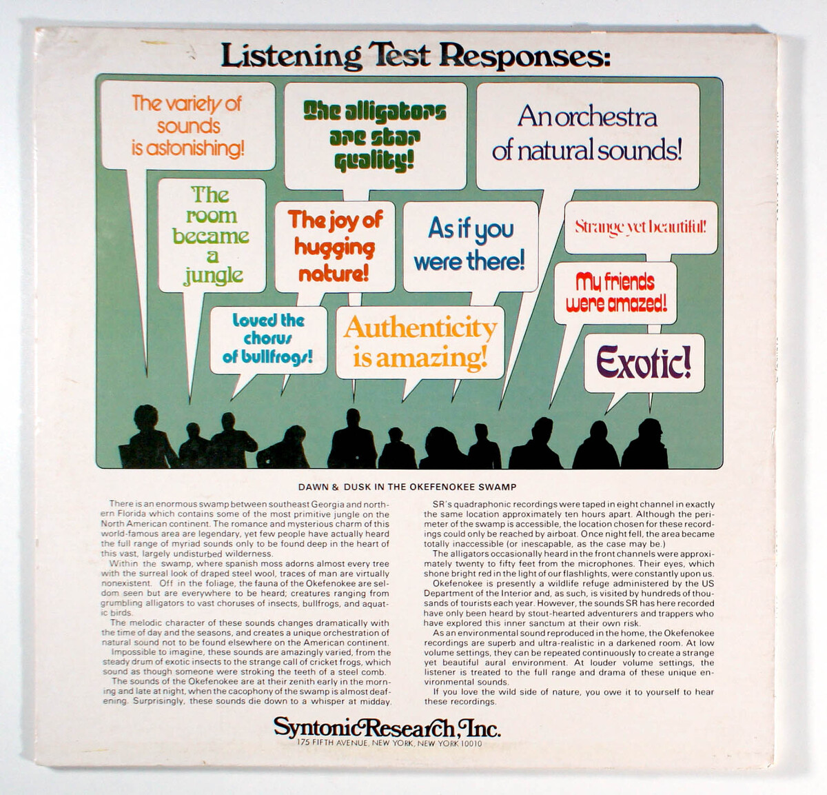 Environments (Totally New Concepts In Sound - Disc 6) is a 1974 vinyl LP released by Syntonic Research Inc., part of the pioneering Environments series of natural sound recordings created by producer Irv Teibel. This sixth installment immerses listeners in the authentic ambient sounds of the Okefenokee Swamp in Georgia, capturing dawn choruses of birds, insects, and wildlife transitioning to dusk with frog calls and nocturnal activity across its two sides. Recorded in quadraphonic sound for an enhanced spatial experience, the album exemplifies the series' innovative use of high-fidelity field recordings without musical accompaniment, aimed at promoting relaxation, concentration, and therapeutic benefits. Historically significant as one of the earliest ambient soundscape projects, the Environments seriesdistributed by Atlantic Recordslaid foundational groundwork for modern sound therapy, ASMR, and environmental audio genres, influencing countless wellness and meditation products. Notably, the album produced no hit singles, as it contains no songs or traditional tracks but rather continuous environmental immersions.