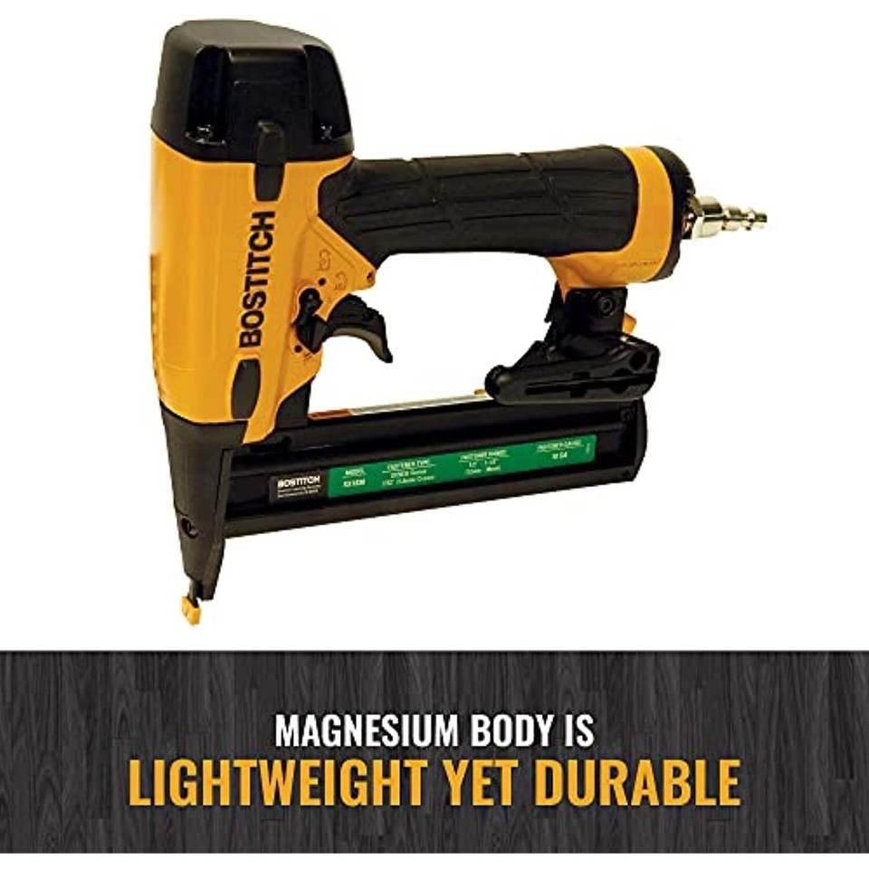 The Bostitch SX1838K 18GA Narrow Crown Finish Stapler is designed for the professional driving 7/32 In. narrow crown staples from 1/2 In. to 1-1/2 In. in length. Along with our other small-body finish tools, this tool is made with lightweight magnesium and has a tough new industrial design. The oil-free engine requires no maintenance and prevents stains on work surfaces, while the swivel air fitting with filtered air inlet increases maneuverability and improves engine durability. The selectable trigger system allows for easy conversion between sequential or contact modes. Additionally, the SX1838K features a dial-a-depth control for quick countersinking adjustments and a low fastener lockout that prevents dry fire and alerts the user when it's time to reload. The ultra-quiet rear exhaust directs air away from the user and the reversable belt hook with integrated pencil sharpener allows for ultimate convenience on the job site. The SX1838K is great for finsh, trim, soffits, cabinetry, furniture, an any other stapling function you can dream up! Kit includes: Stapler and durable carry case.