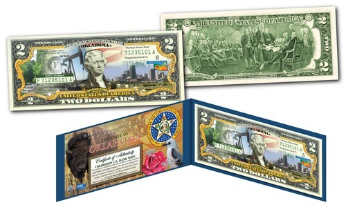 Celebrate America with the popularity of the statehood series with these colorized $2 bills. Each bill features the state's name, bird, flower, nickname, emblem, year of admission, and State Quarter graphic. The State Quarter featured on the bill is an actual watermark security feature?the first of its kind! Americans from all over the country are rushing to obtain the new ?Statehood? Genuine Two Dollar bills, while they last. The coveted U.S. Government $2 bill is rarely seen in circulation and only banks and currency dealers may obtain special uncirculated bills directly from the Federal Reserve Bank. Now for the first time ever these enhanced uncirculated full color two dollar bills are available exclusively from this limited time offer. Two dollar bills are among the most beautiful of all U.S. circulating currency and now the rarely circulated $2 bill is even rarer with exclusive overlay of our beautiful States. Each Bill comes with a full-Color Certificate of Authenticity handsomely displayed in a Special Gold Foil Museum-Quality Folio. Don?t Miss Your Chance to Order?.Very Limited Quantity Available!