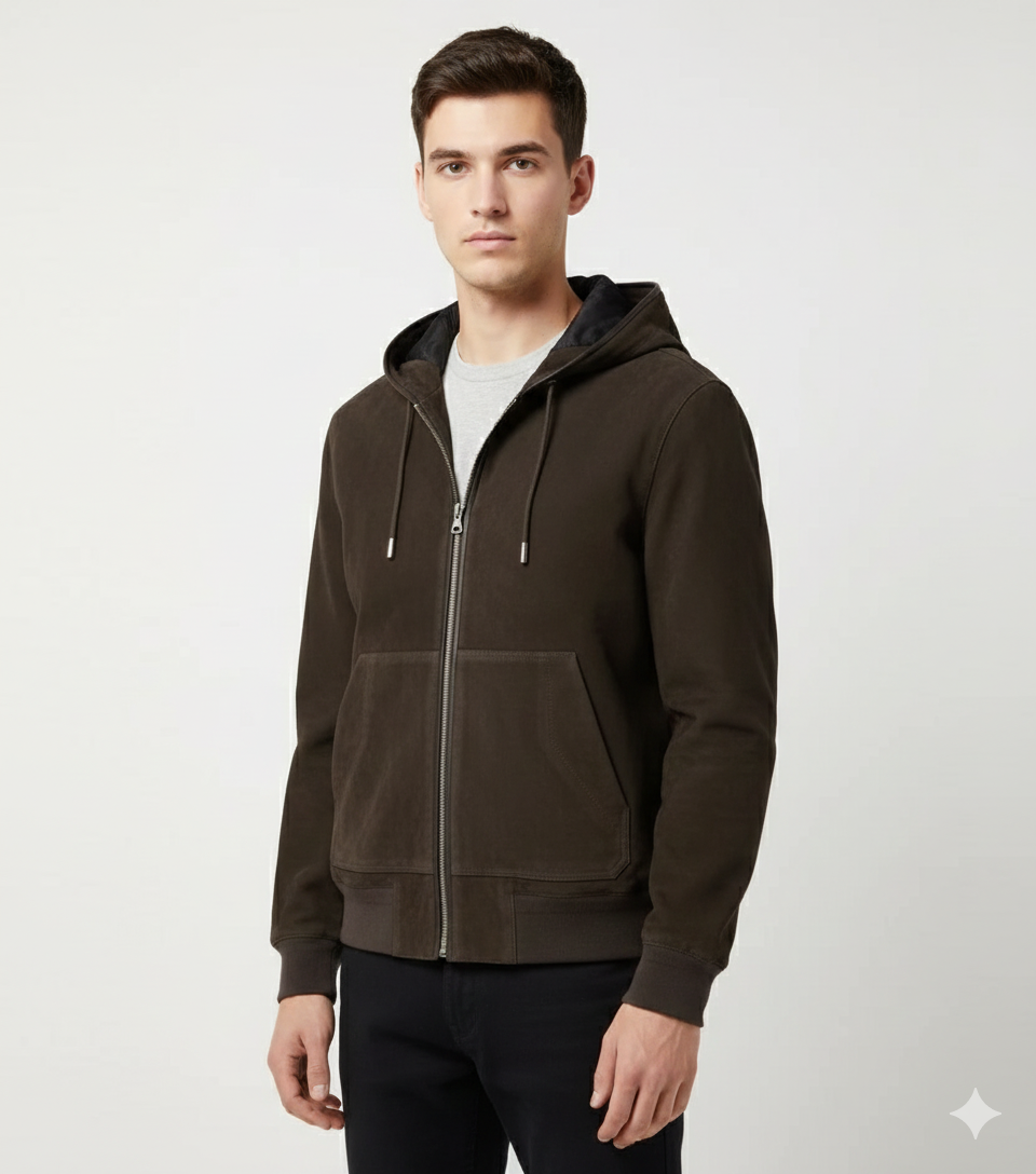 Stylish Lambskin Bomber Jacket Men's Handmade Suede Leather Brown Hooded Genuine