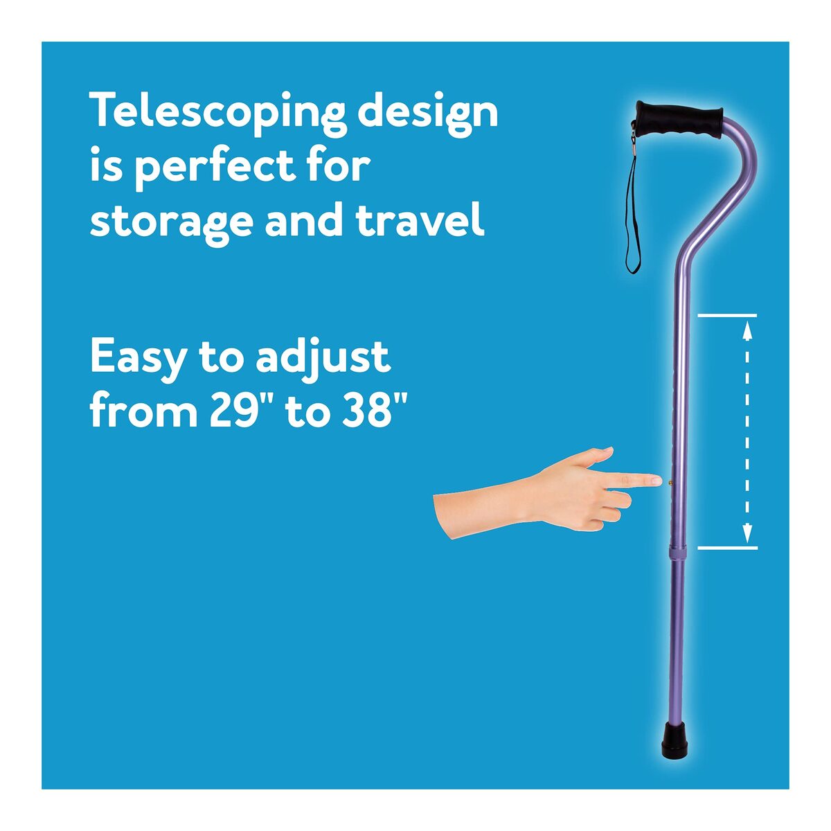 Product description: For anyone looking for a stable source of support, offset walking canes are a great choice. The Carex offset cane's handle is positioned over the length of the shaft, so your weight is evenly distributed for added support and stability. Its ergonomic cane handle offers added support and a comfortable grip. It is height adjustable from 30.5" to 39.5" with the push of a button and features a convenient wrist strap to prevent it from falling if dropped. A lightweight walking cane. When choosing a cane, you'll need something lightweight. This ergo offset cane is designed with aluminum to make it lightweight at just 12 ounces. Designed with comfort in mind. For anyone regularly using a cane for walking support, comfort is critical. This ergonomic walking cane sports a soft and shock-absorbing grip handle to offer more padding and comfort when in use. It's ergonomically designed to wrap to your fingers, making it great for anyone with carpal tunnel, arthritis, or any other hand condition. Match your style with a variety of colors and patterns. We believe canes can double as a base of support and a fashion statement. Choose from six different colors and patterns, including black, blue, purple rose, black flower, or blue flower. Easy height adjustment. Adjust the height from 30.5" to 39.5" with just the push of a button to match your height. Reliable support for balance and walking. Canes with offset handles are some of the safer types of walking canes. Our ergo offset cane has a weight capacity of 250 lbs, making it one of the more ideal canes on the market. It's designed for elderly persons or those with balance and walking issues that need high-quality support. Weight Capacity: 250 lb Height Adjustable: Yes Folding: No Package Weight: 12.6 oz.Product Weight: 12 oz.Wrist Strap: Yes Handle: Ergonomic Offset Tip: Package Dims (h x w x d): 26.5" x 7" x 2" Product Dims (h x w x d): 30.5" -39.5" x 6.8" x 2" Color: Black, blue, purple rose, black flower, or blue flower.