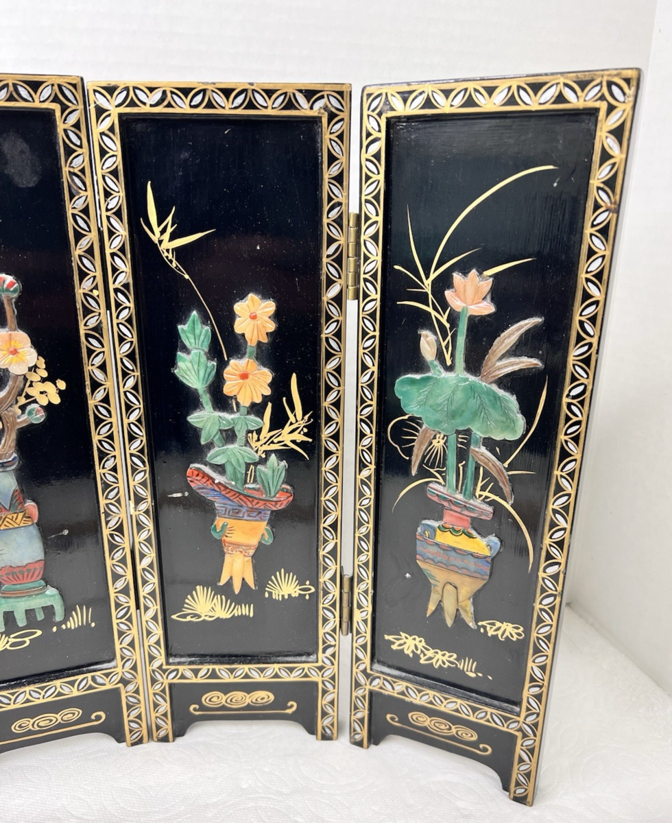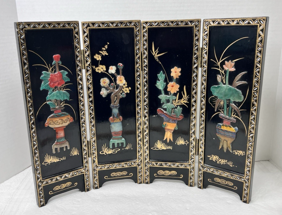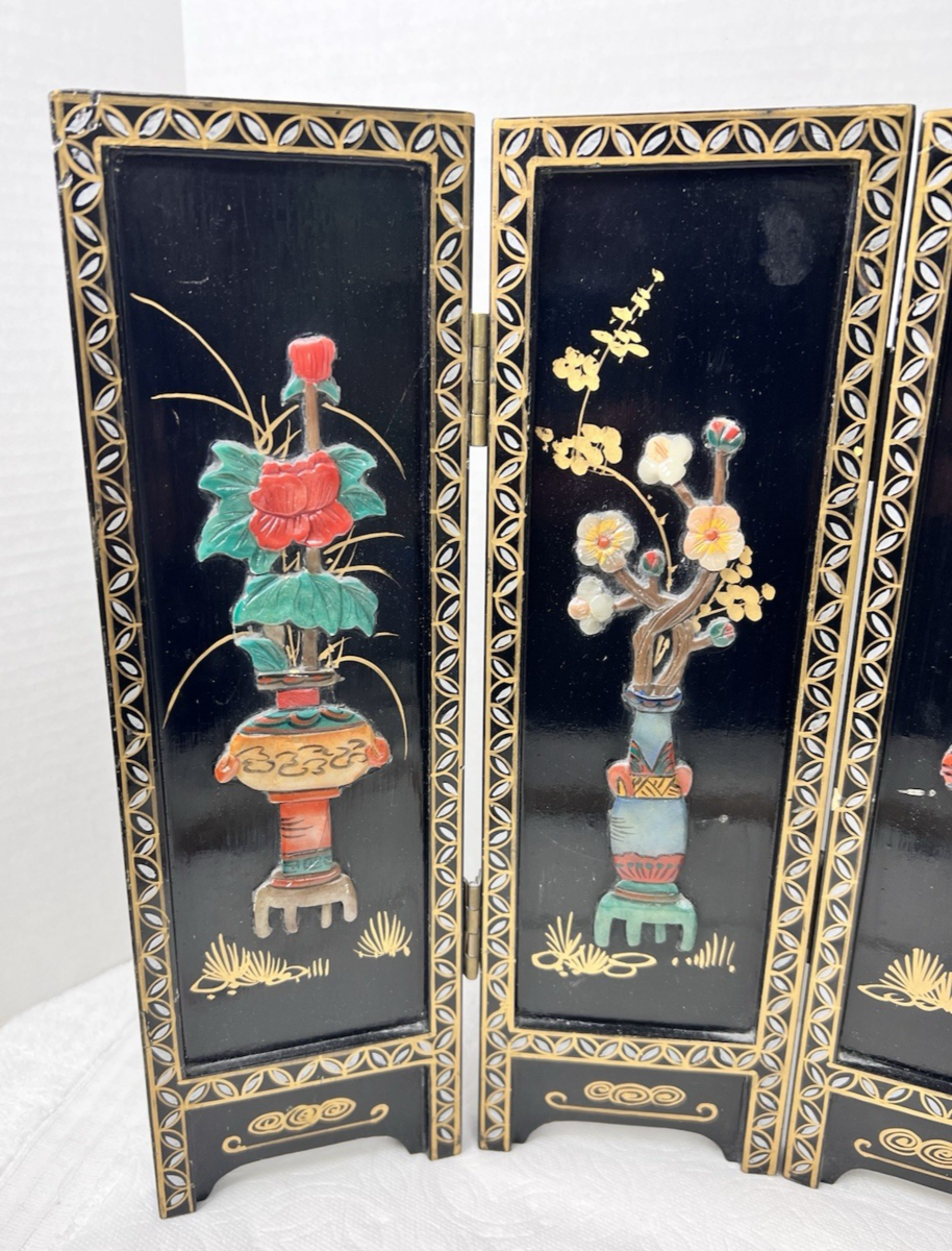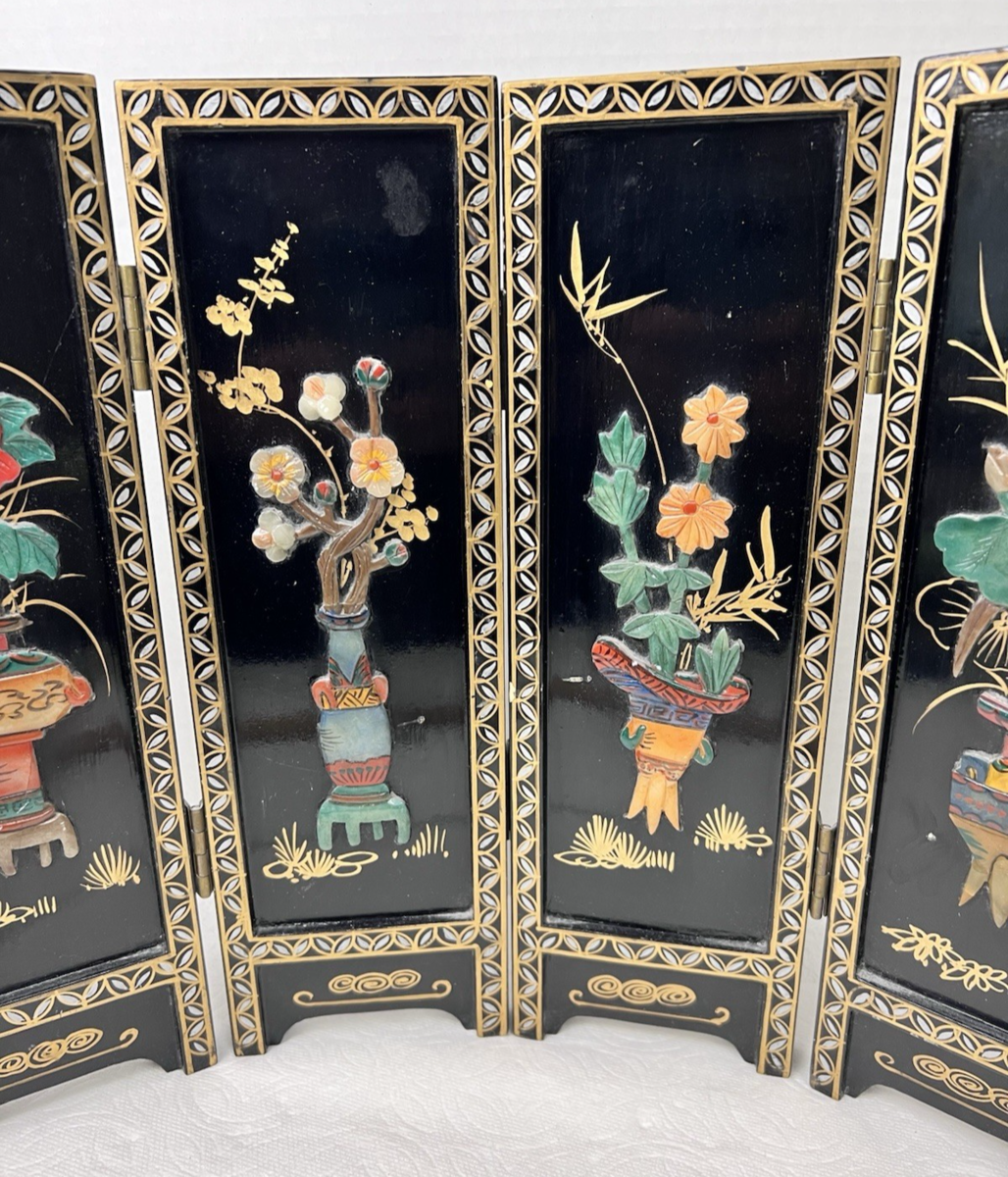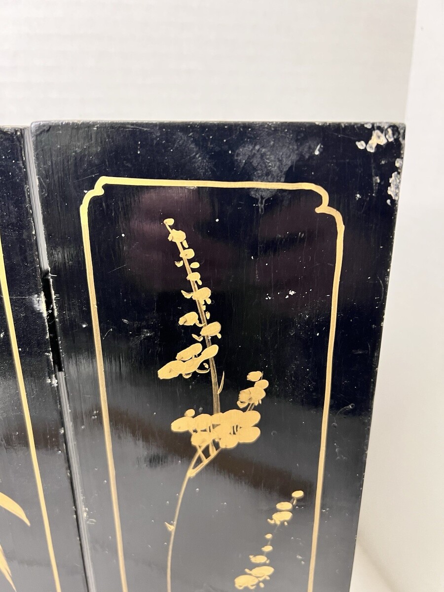 VTG Asian Style Ebonized Chinoiserie Four-Panel Mini Screen Floral Table SZ 14" It has wear mailing paint marks small scratches that can be repainted. Each panel is 14 inches tall by 4 3/8 easy repairs with a little black paint