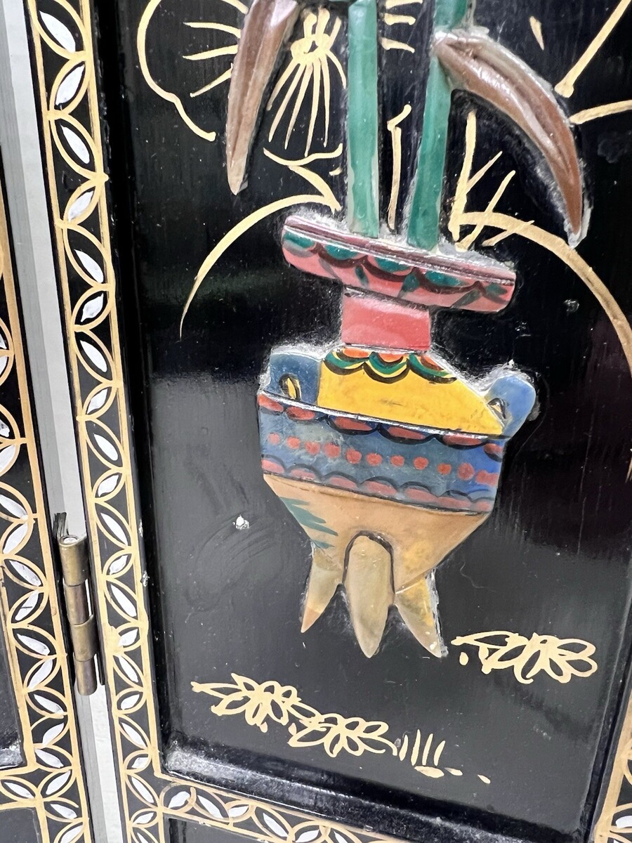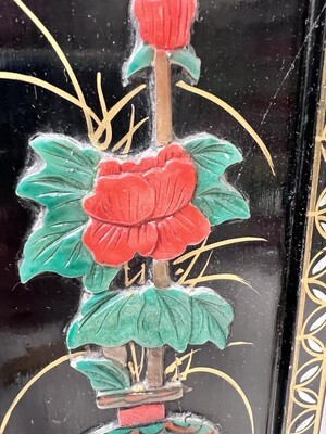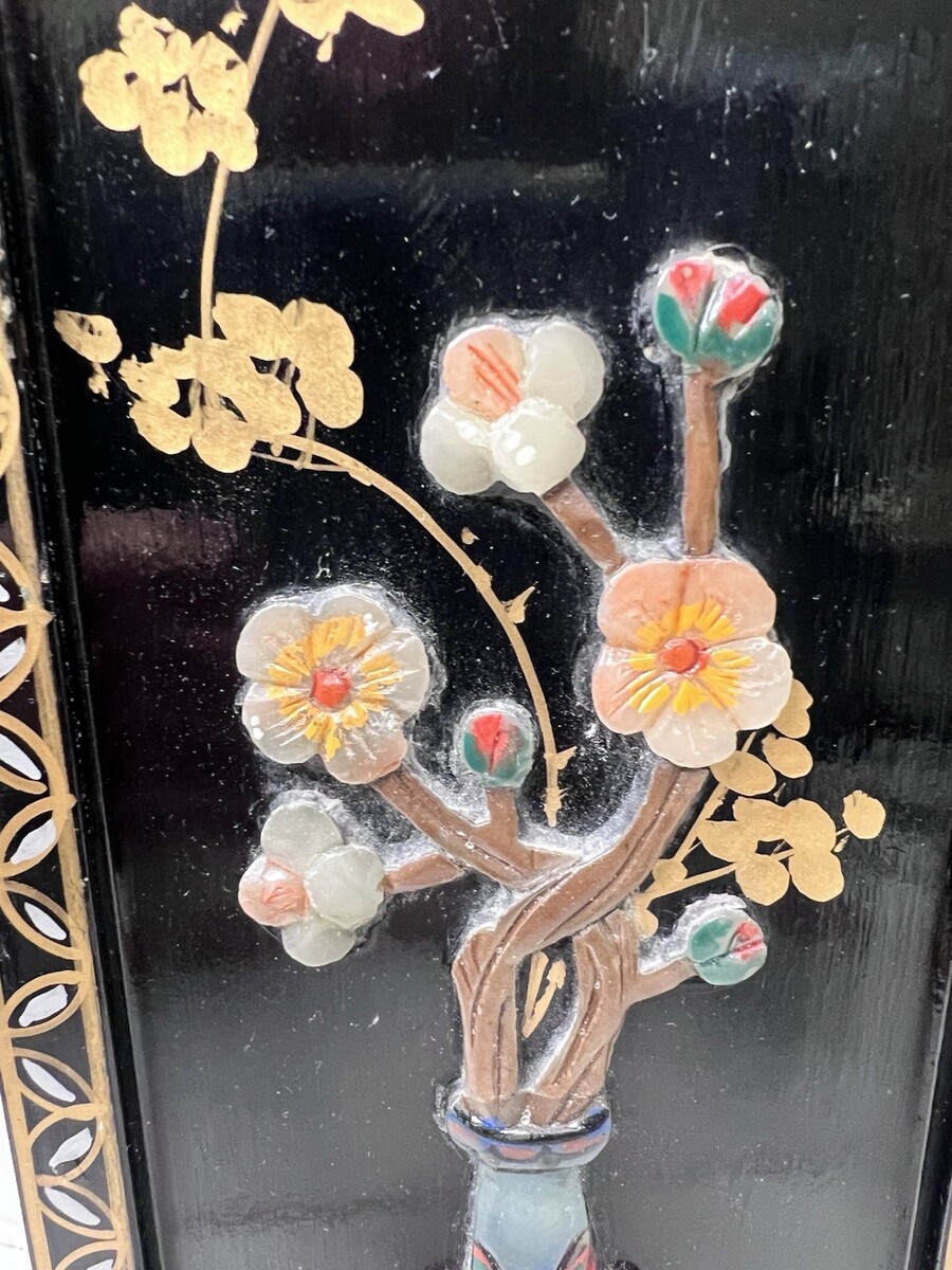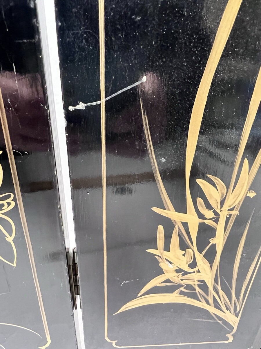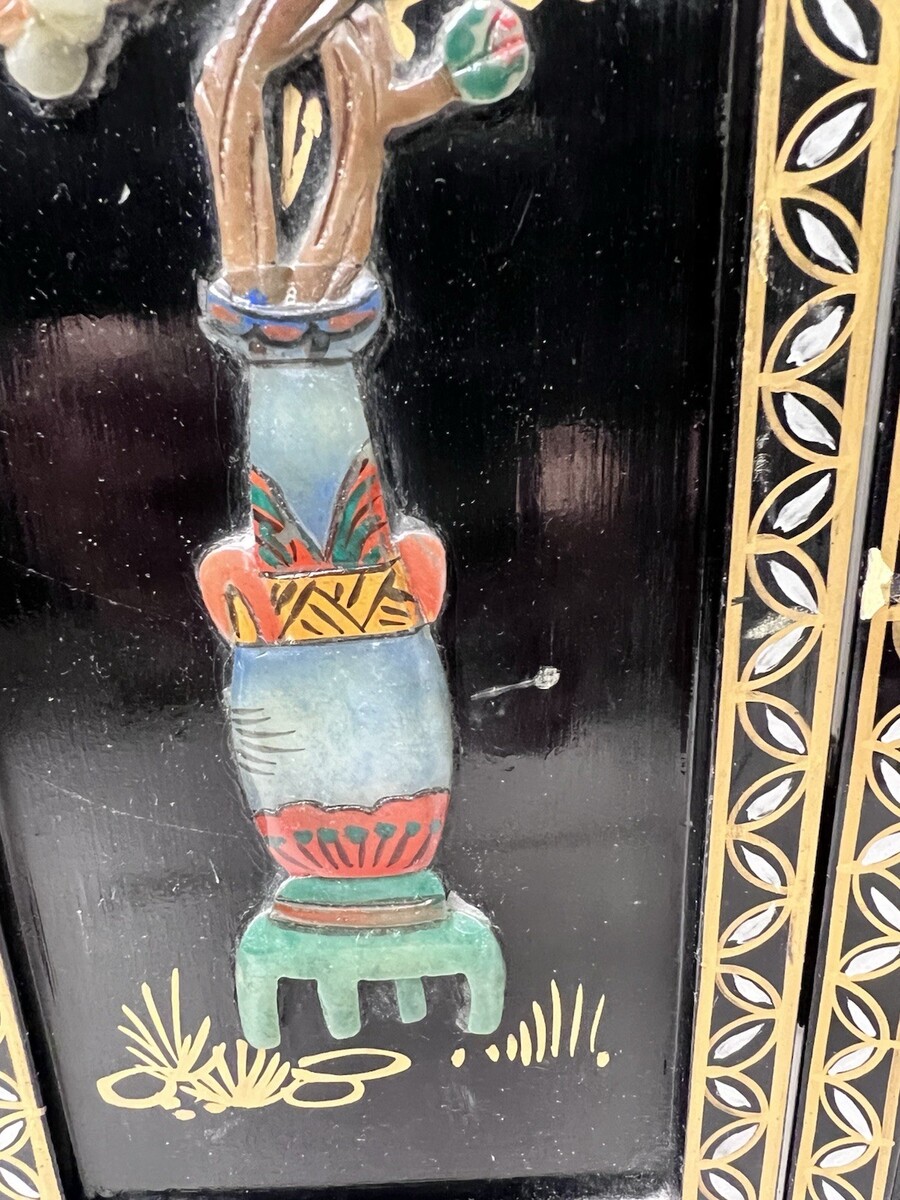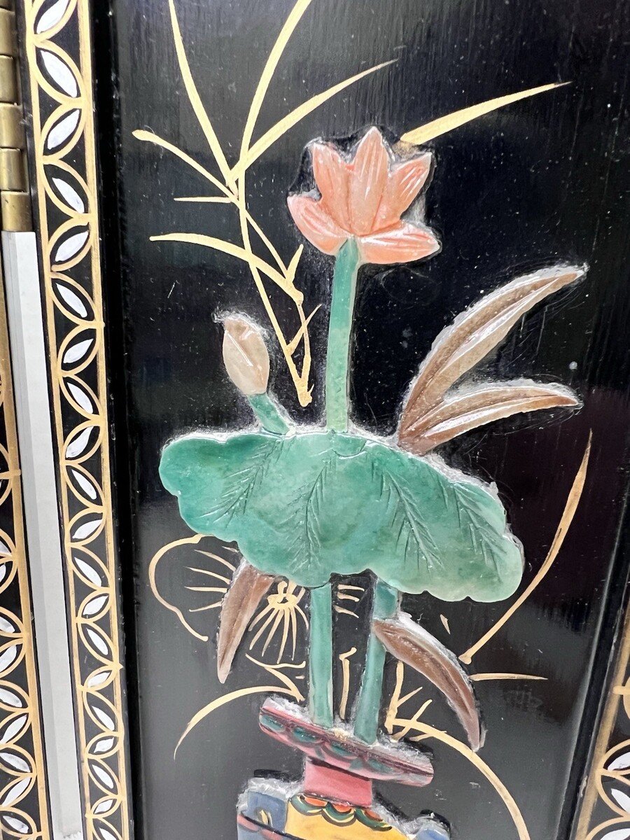VTG Asian Style Ebonized Chinoiserie Four-Panel Mini Screen Floral Table SZ 14" It has wear mailing paint marks small scratches that can be repainted. Each panel is 14 inches tall by 4 3/8 easy repairs with a little black paint