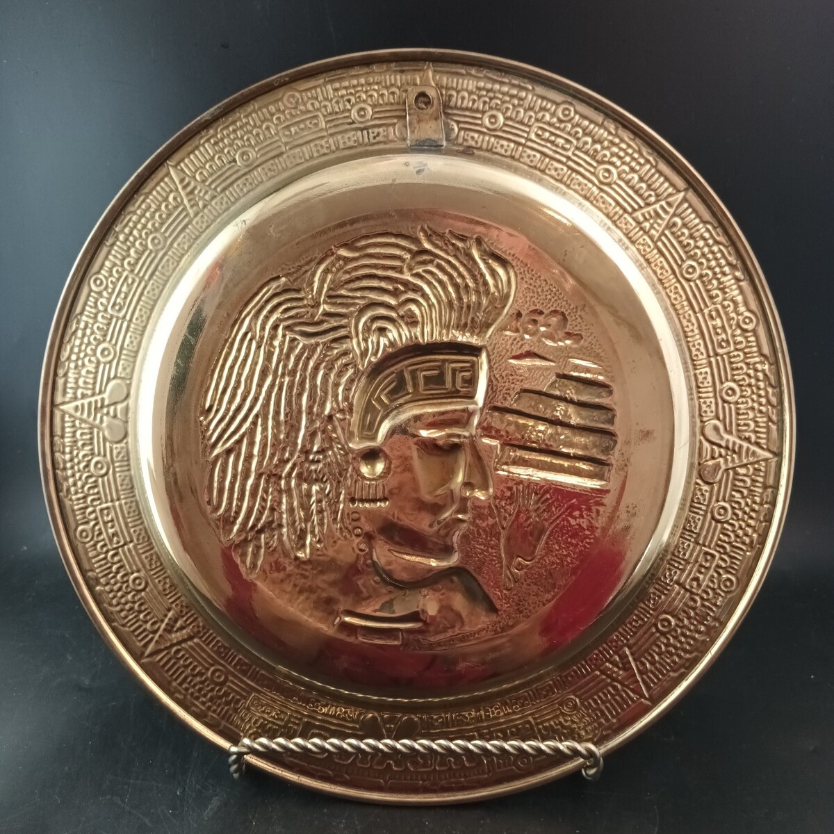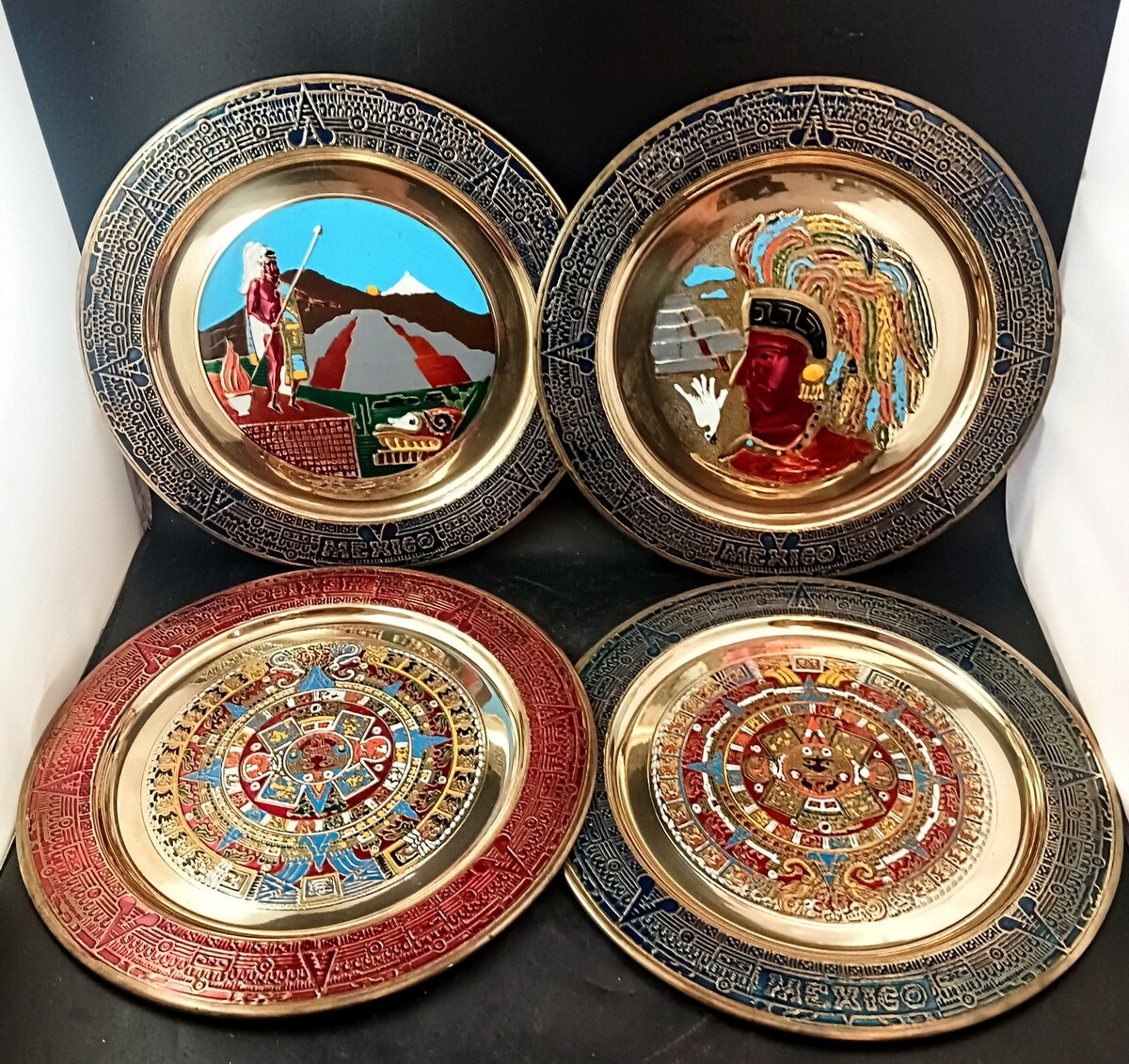 4 Aztec Mexico Brass & Enamel Wall Hanging Plates 11" Vintage, Selling OBO