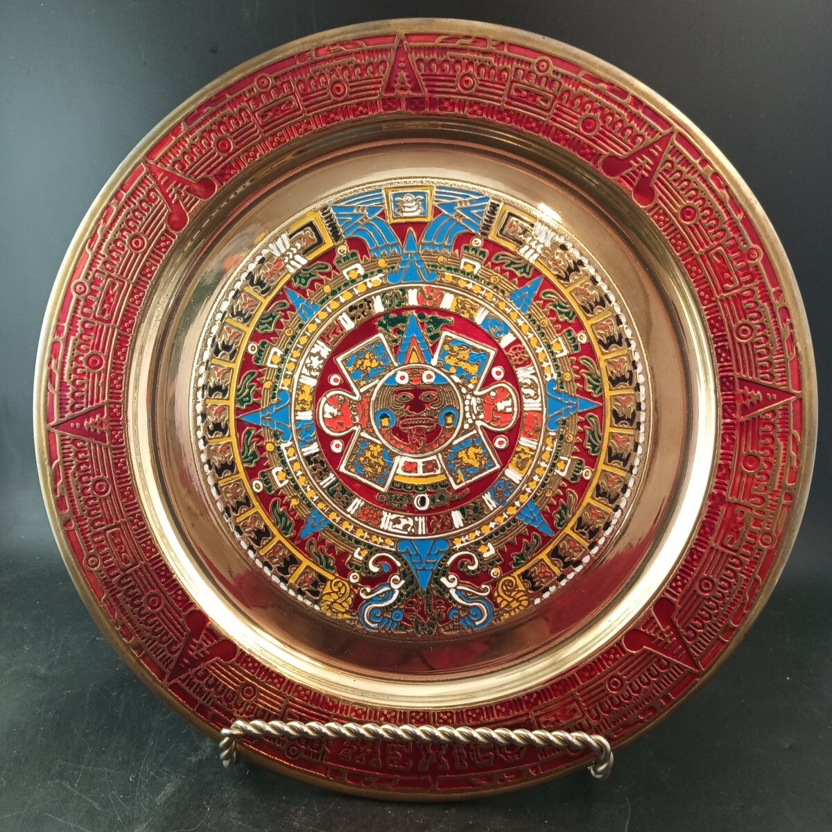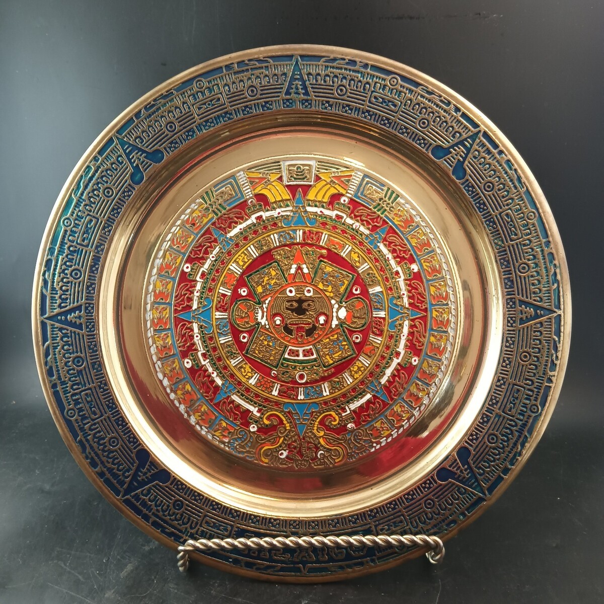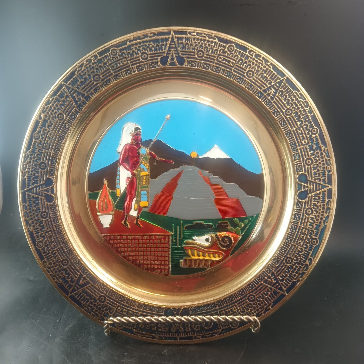 "These vintage Aztec Mexico brass and enamel wall hanging plates are intricately handmade in Mexico, reflecting the rich cultural heritage of Mexico. The multicolored plates feature traditional Aztec designs and motifs, adding a touch of authenticity and history to any space. At 11 inches in diameter, they make a striking statement in any room and are sure to be a unique addition to any collection. Please feel free to make an offer and bring a piece of Mexican culture into your home."
