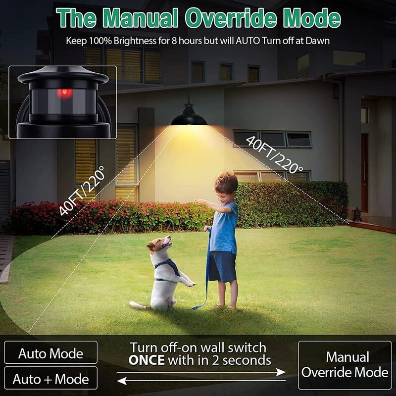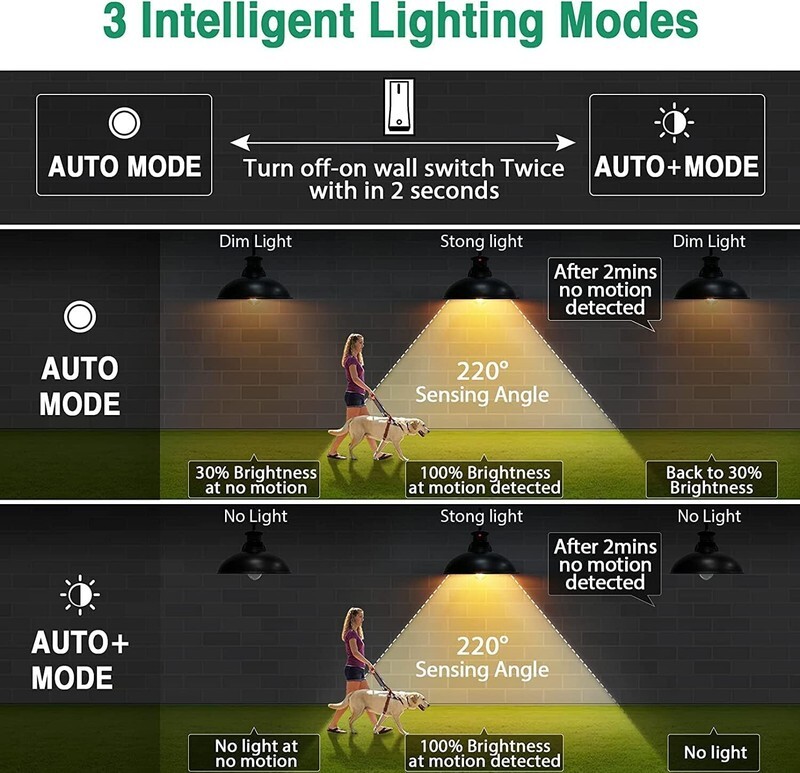 3 Lighting Modes, Overnight Security, Motion Sensor, Dusk to Dawn |