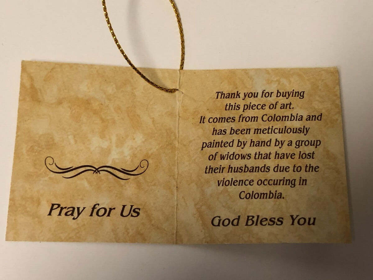These statue were made by a group of widows that have lost their husbands due to the violence occurring in Colombia. They are hand painted. It's from the Liscano, Inc. Collection.
