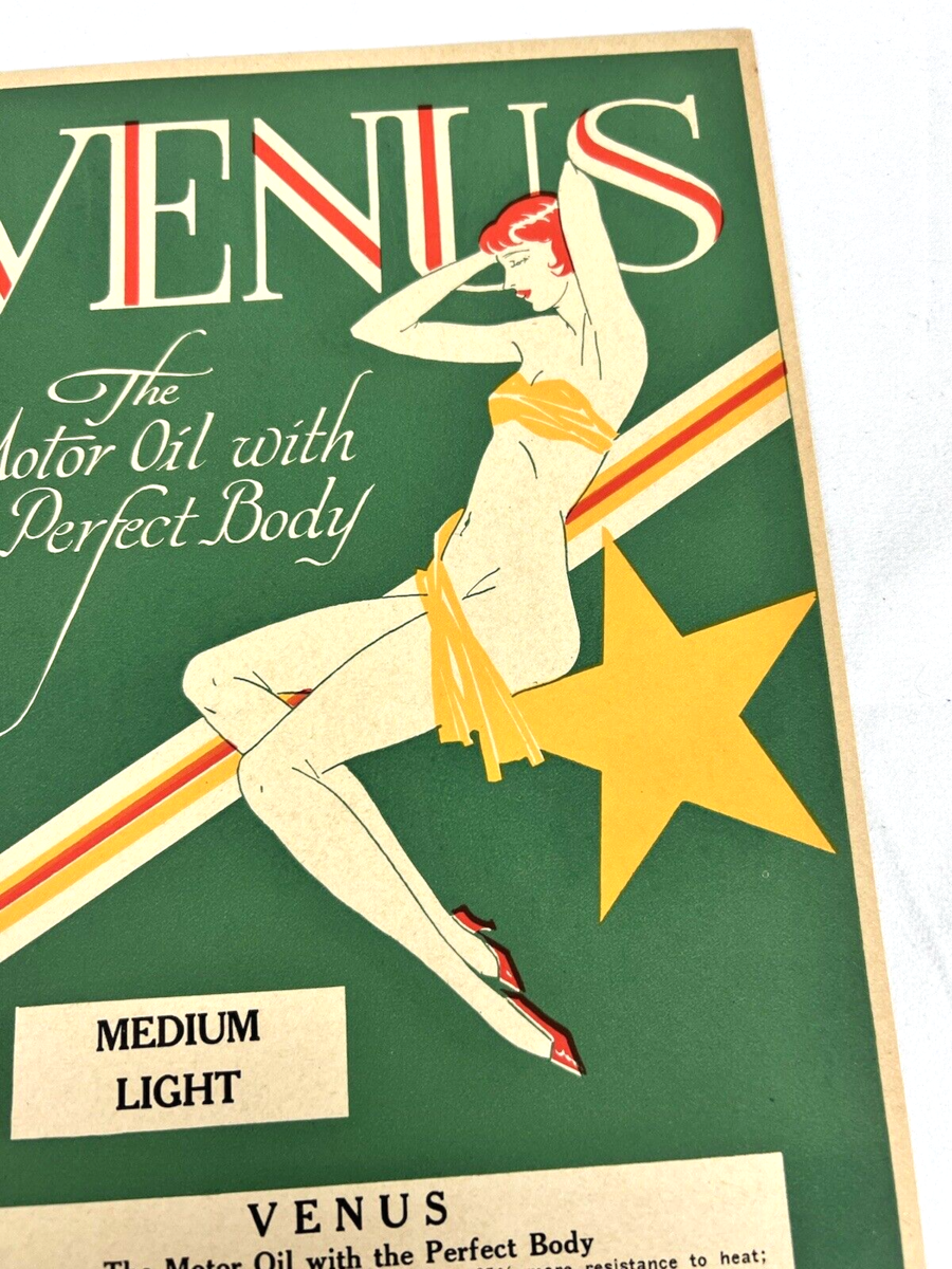 Vintage 1929 Venus Motor Oil Co Label Has Red Haired Pin Up on a Star 6 3/4 x 10 1/2". Definite deco vibe. Great condition. See photos.