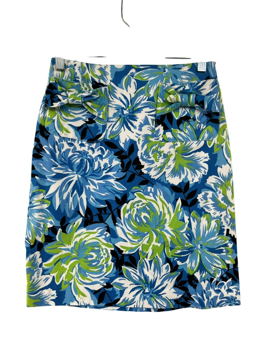 Beautiful floral print skirt in a bold blue, green, black, and white palette. Features a textured cotton-blend fabric and cute bow-accent front pouch pockets. Comfortable stretch with a classic A-line shape?perfect for work, church, or spring/summer outfits.
