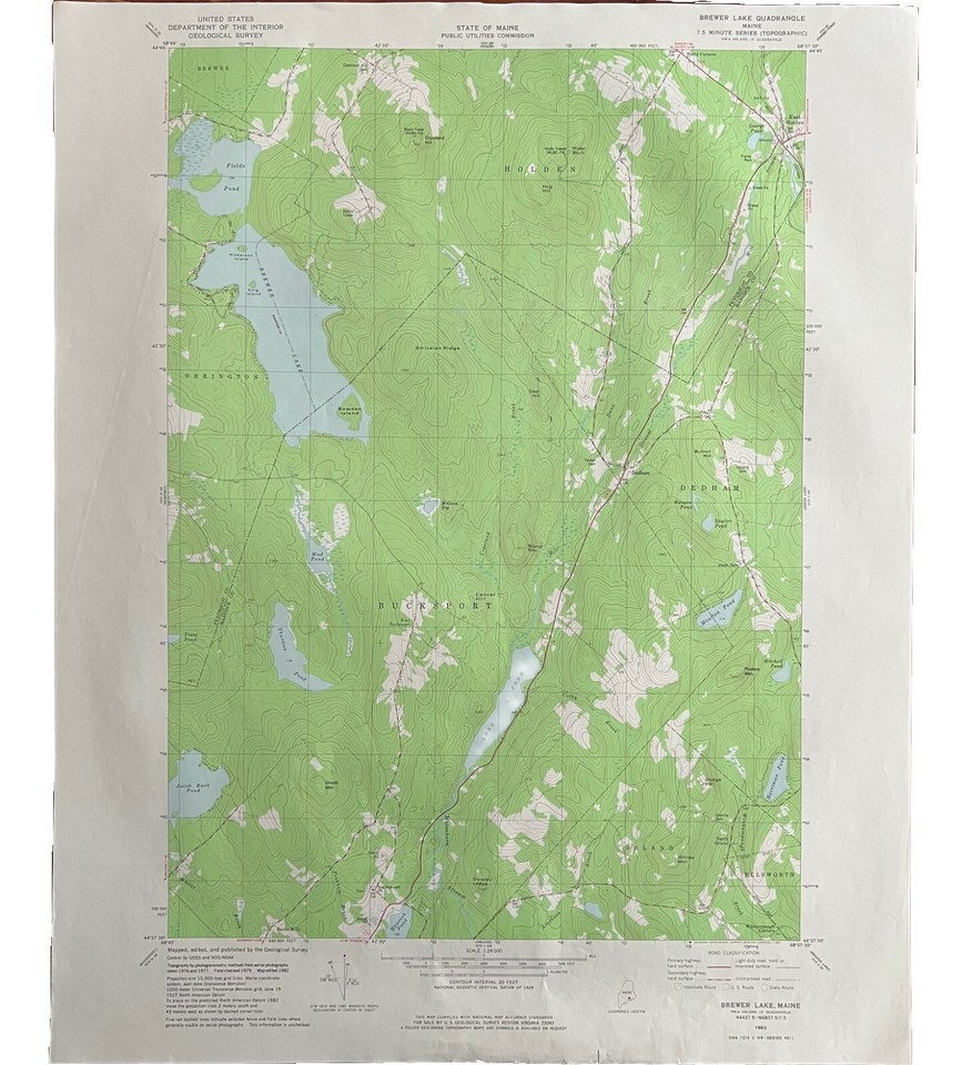 Map Brewer Lake Maine USGS 1982 Topographic Geological 1:24000 27x22" TOPO17