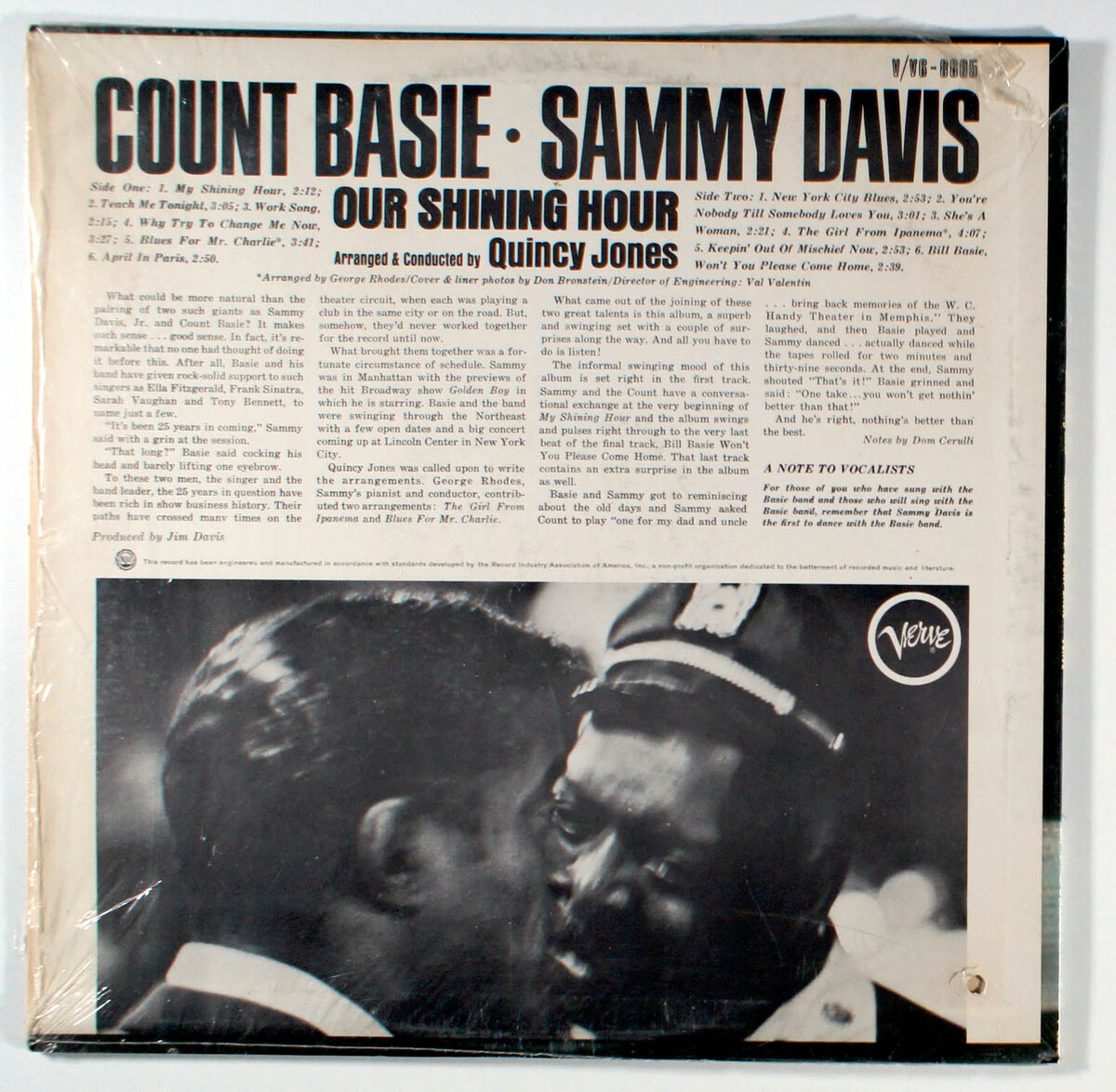 Still in ORIGINAL SHRINK-WRAP (opened), with HYPE-STICKER. Vinyl plays nicely (play-graded). Cover has a few creases near edges; (front/back); split in shrink near bottom-right. Inner-sleeve is original (Verve logo); one seam partially split. Spine is easy-to-read with very mild-wear (small section of missing shrink). Little shelf-wear along top/bottom-edge; minor wear to corners. Opening is crisp with signs of light use. Late 70's pressing with black and sliver label. (Hole-punch in bottom-left.)