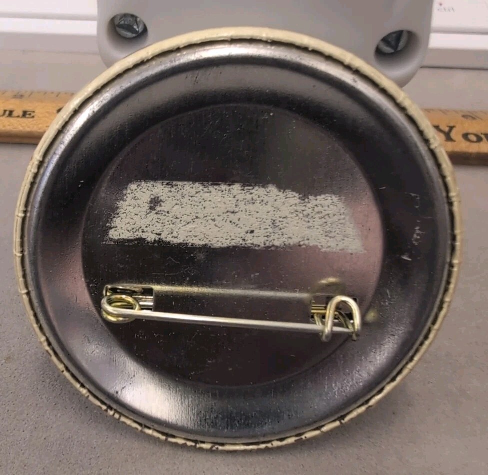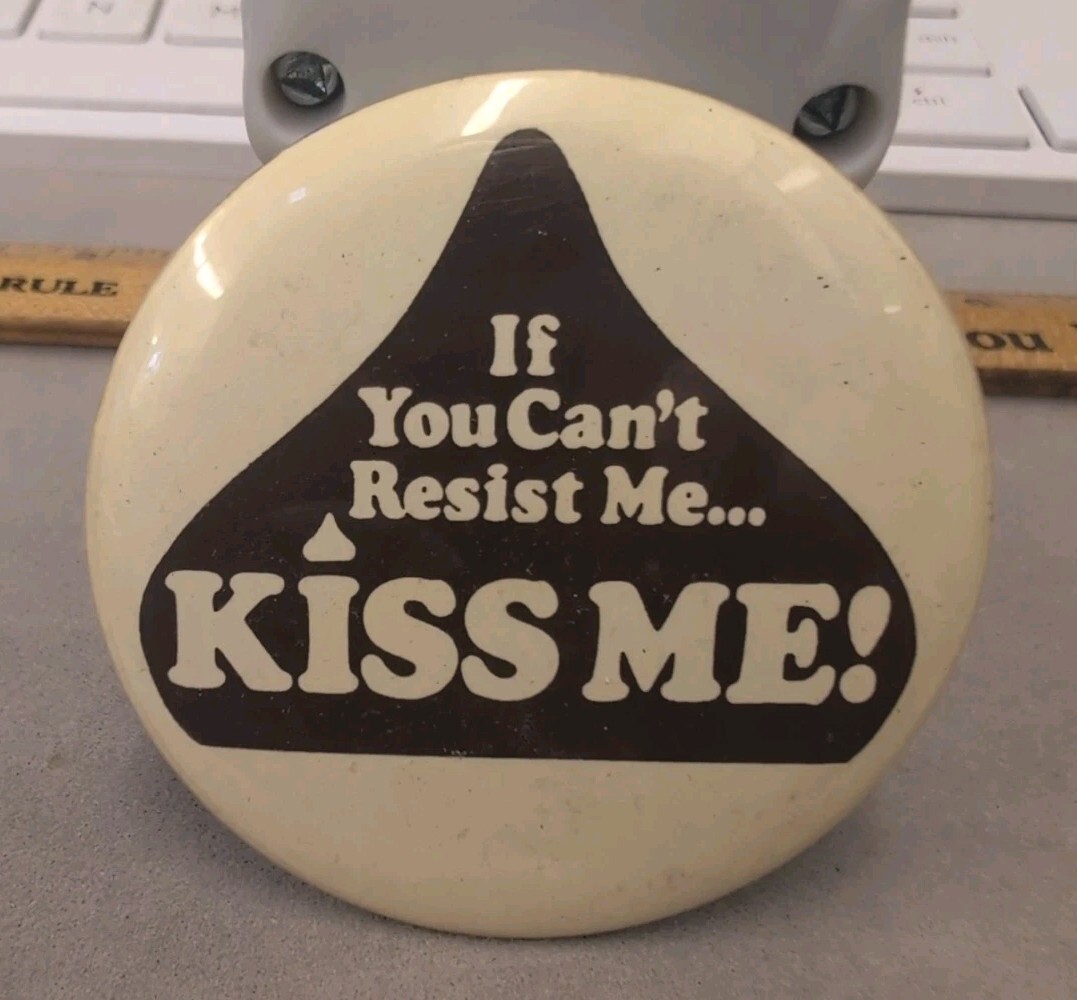 Vintage metal pinback button. Measures 2-1/8" across. No smoke or pet odor. Hershey kiss advertising. If you can't resist me, kiss me. Chocolate brown on a cream background.