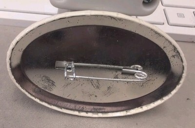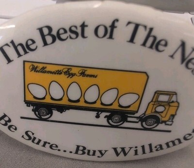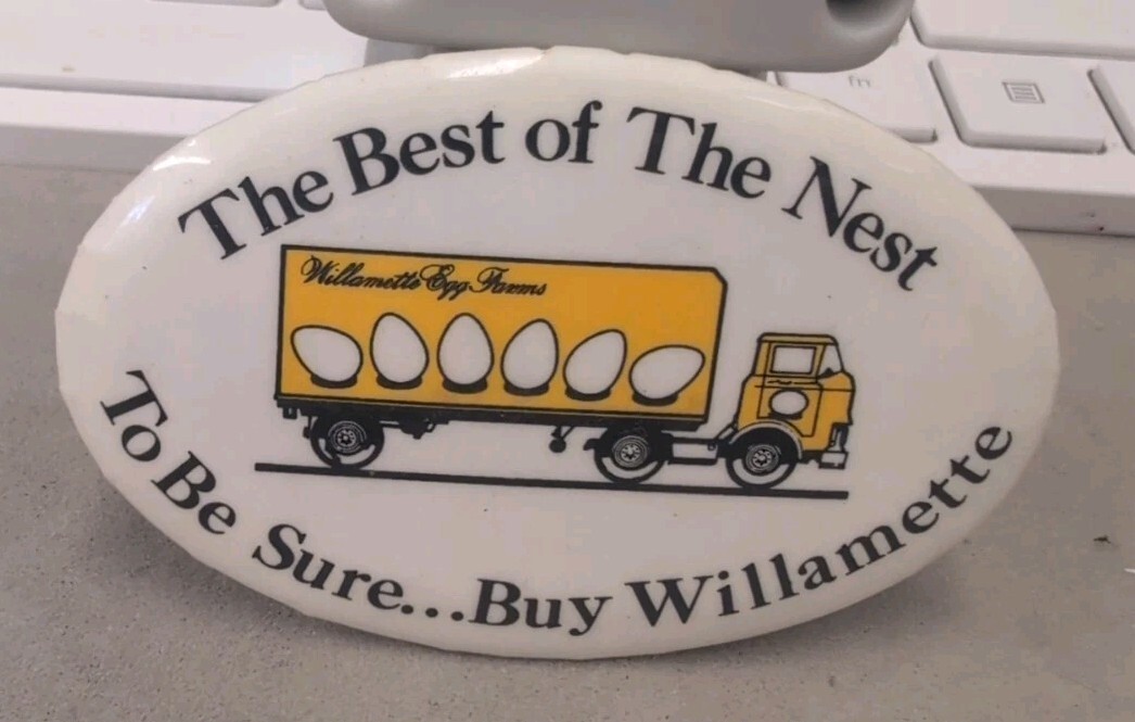 Vintage metal pinback button. Measures 2.75" across. No smoke or pet odor. Unique oval style. Advertising for Willamette egg farms in Oregon.