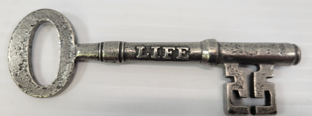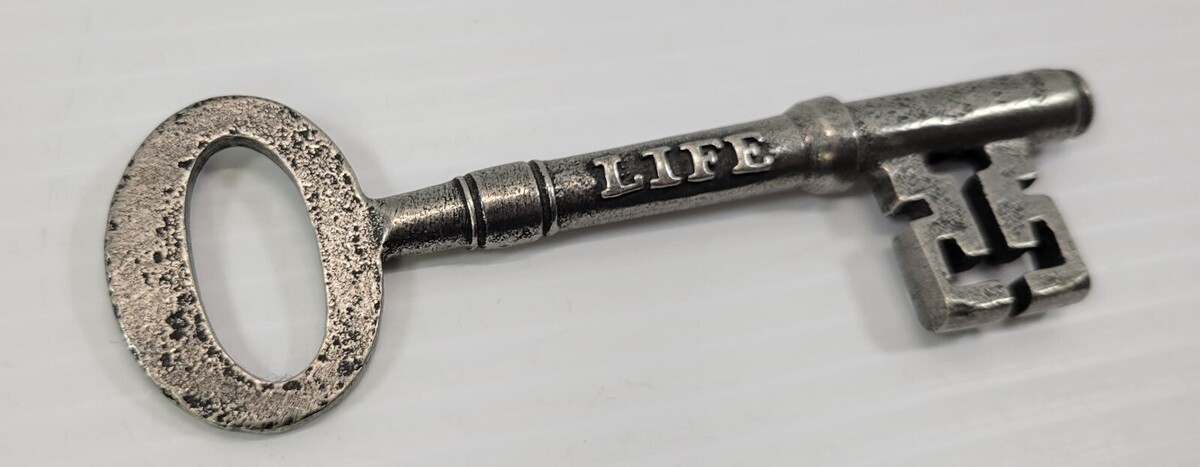 *B54) Vintage Cassiopeia Pewter Key to Life Victorian Gate Skeleton Key