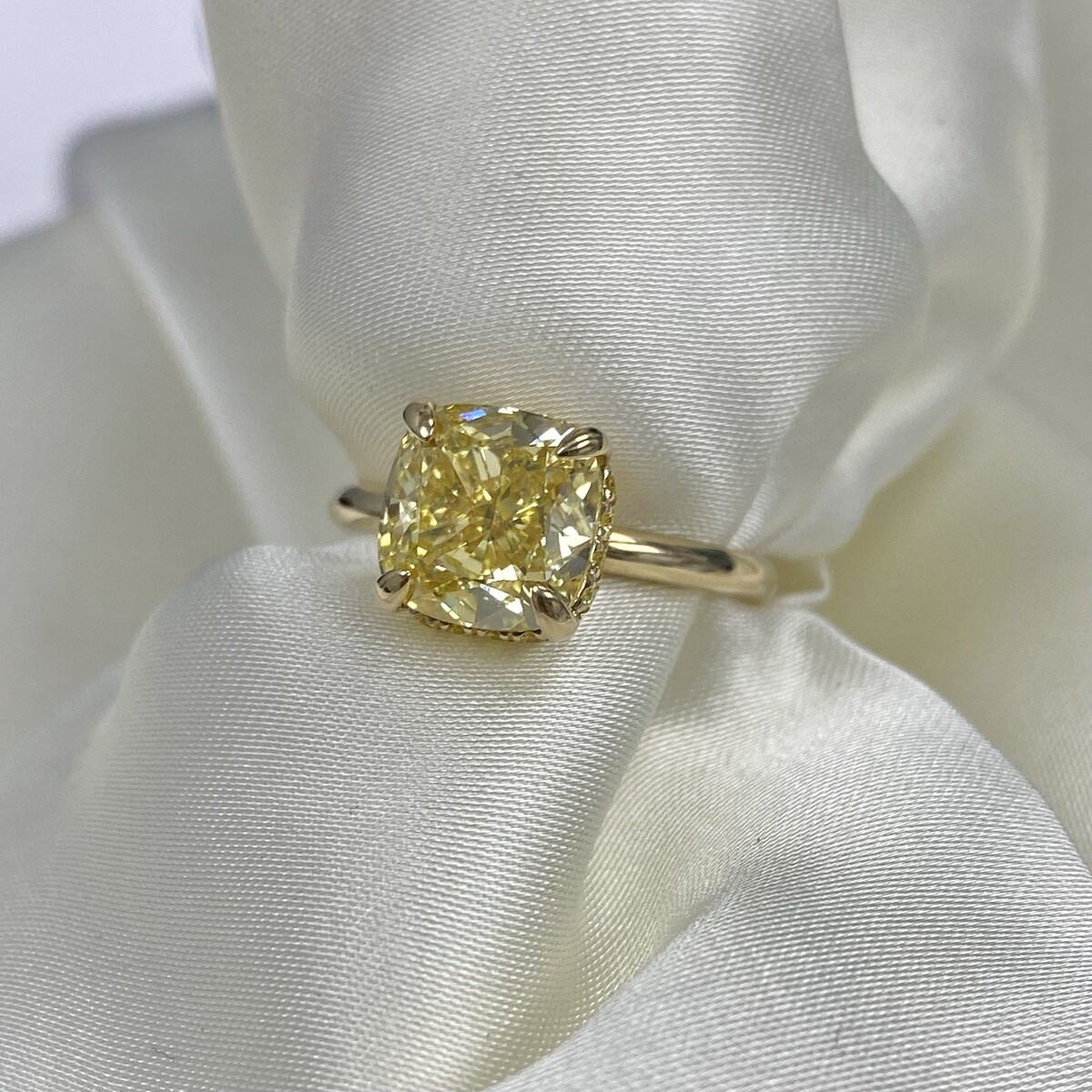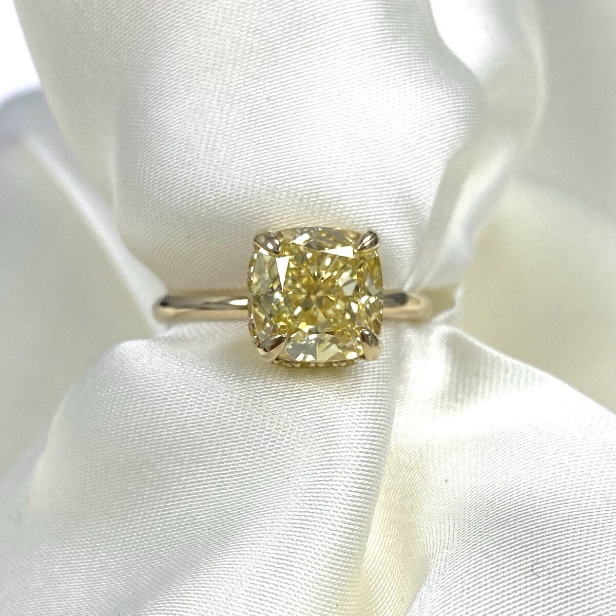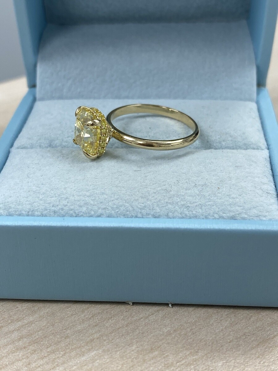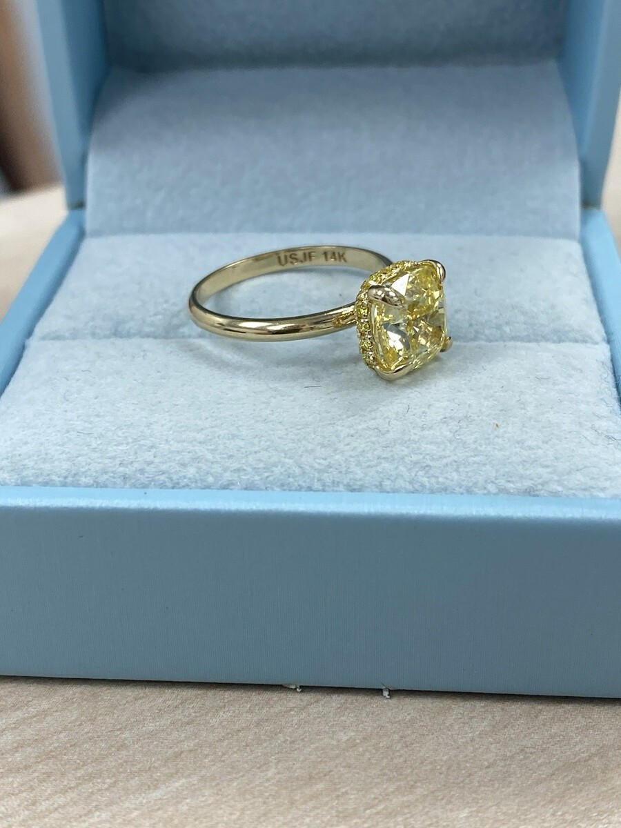 Anillo de compromiso IGI de diamantes tipo cojín cultivados en laboratorio de 3,50 TCW (3,19 quilates) en oro amarillo de 14 k