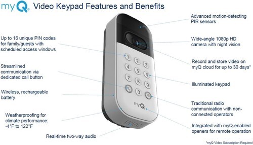 Up to 16 unique PIN codes for families/guests with timed access windows. Optimized communication via dedicated call button. Wireless rechargeable battery. Weather resistant for climate performance: -4F to 122F. Two-way audio in real time. Advanced PIR motion detection sensors. Wide-angle 1080p HD camera with night vision. on myQ cloud for Up to 30 days Illuminated keypad Traditional radio communication with unconnected operators Integrated with myQ-enabled openers for remote operation.