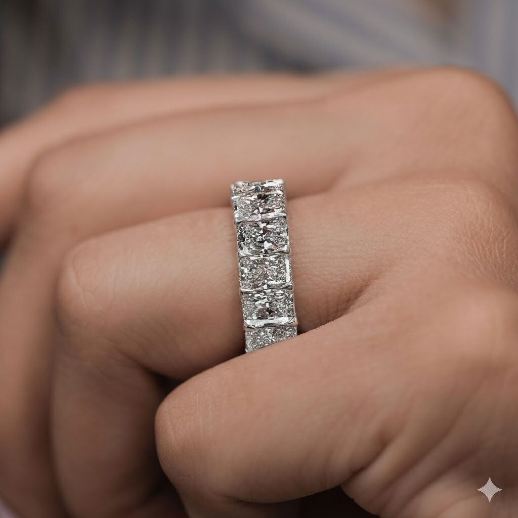 Make a bold and luxurious statement with this Handmade 5.00 TCW Radiant Cut Lab Grown Diamond Full Eternity Band. Beautifully crafted in solid 14K white gold, this striking ring features a continuous row of radiant cut lab grown diamonds, expertly set around the entire band for maximum brilliance and fire.