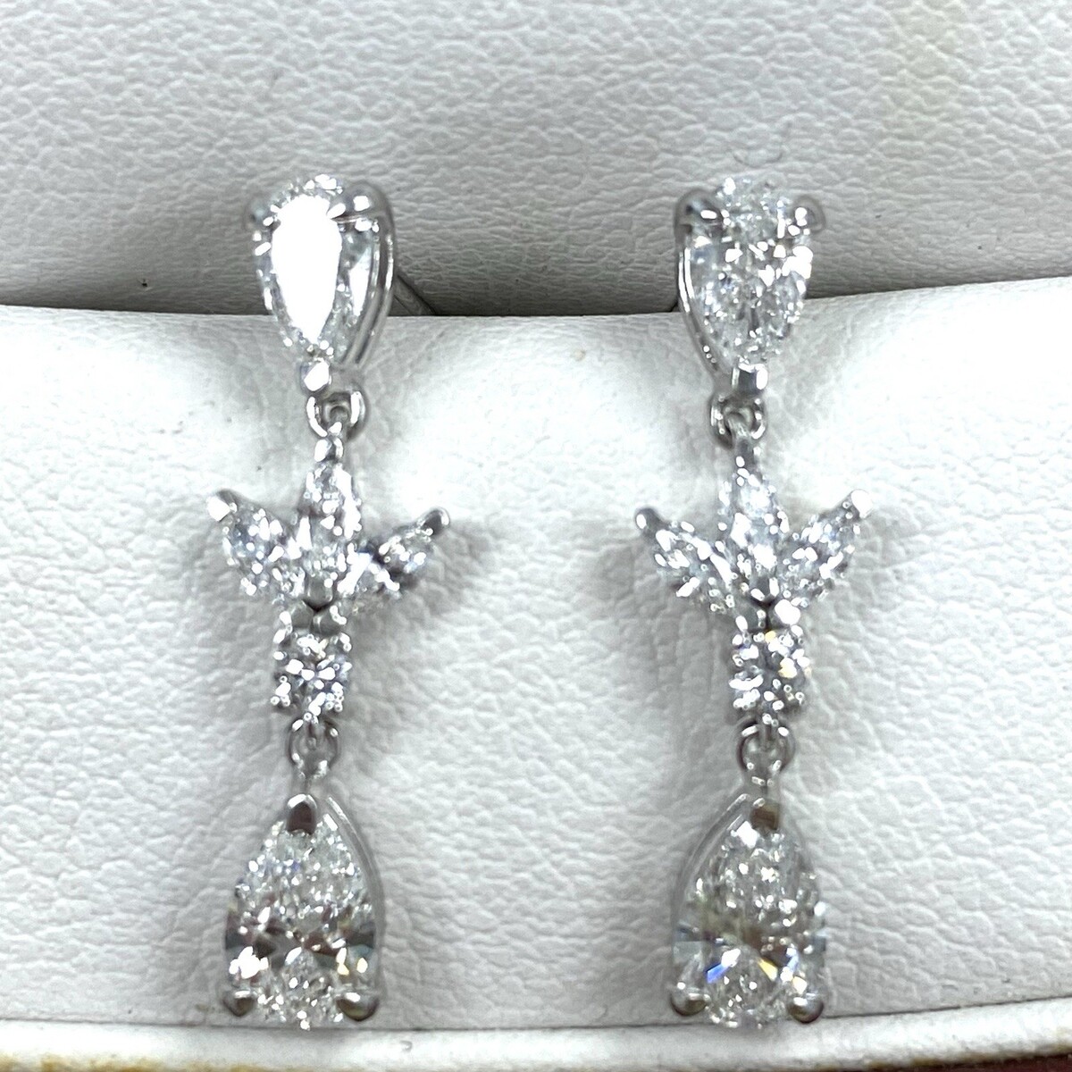 Ces boucles d'oreilles sont absolument superbes! La combinaison d'une pierre centrale de coupe brillante en laboratoire avec marquise en laboratoire et diamants ronds situes en or blanc 14 carats doit creer un effet eblouissant. Les diamants cultives en laboratoire offrent non seulement la beaute mais aussi la durabilite, ce qui est un merveilleux choix pour ceux qui sont conscients de l'impact environnemental. Ces boucles d'oreilles sont sûrs d'ajouter l'elegance et sparkle a tout ensemble de mariee. Le poids total des carats est de 2,00 carats. Nos produits sont tous fabriques a la main avec de la qualite et des soins, au c?ur du district de Diamond sur la 47th Street a New York. Notre devouement et notre engagement envers le travail et la qualite fins depassent tous les autres. Etant do
