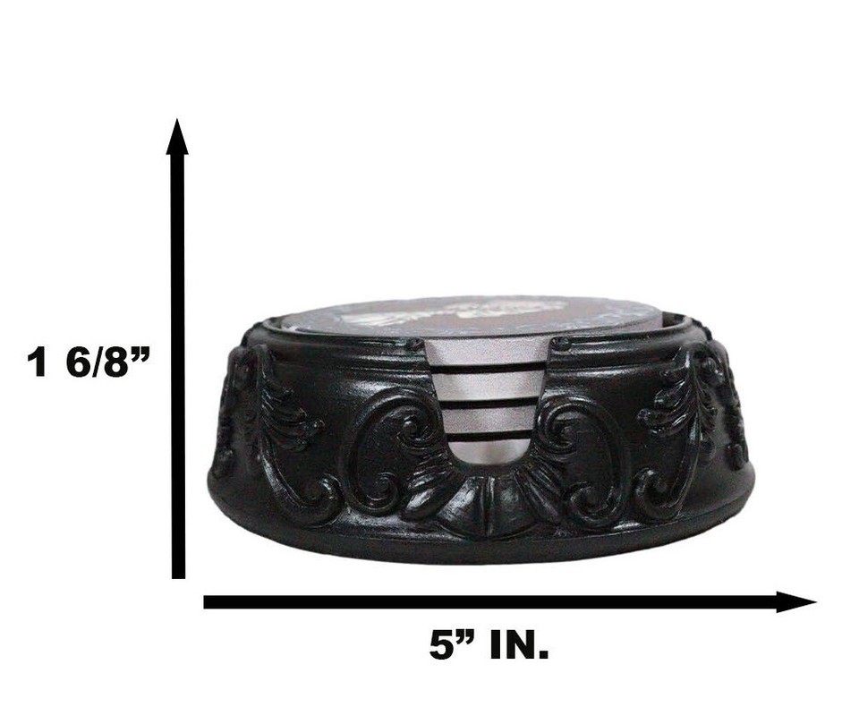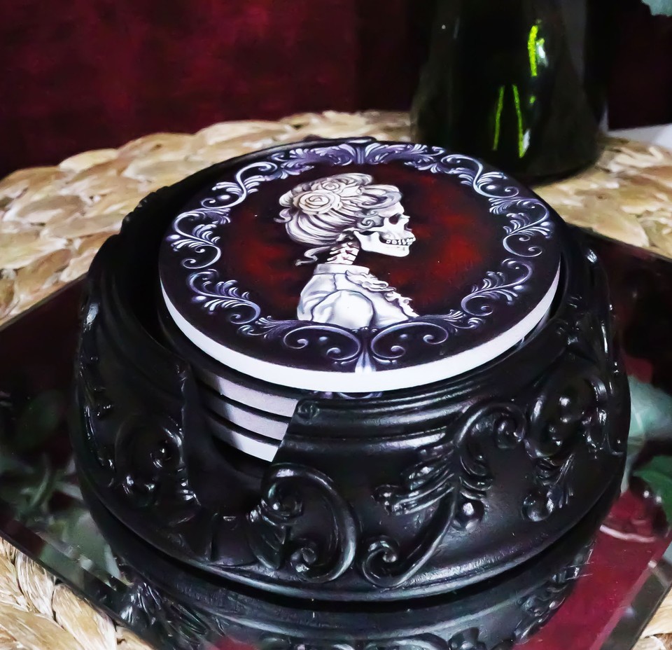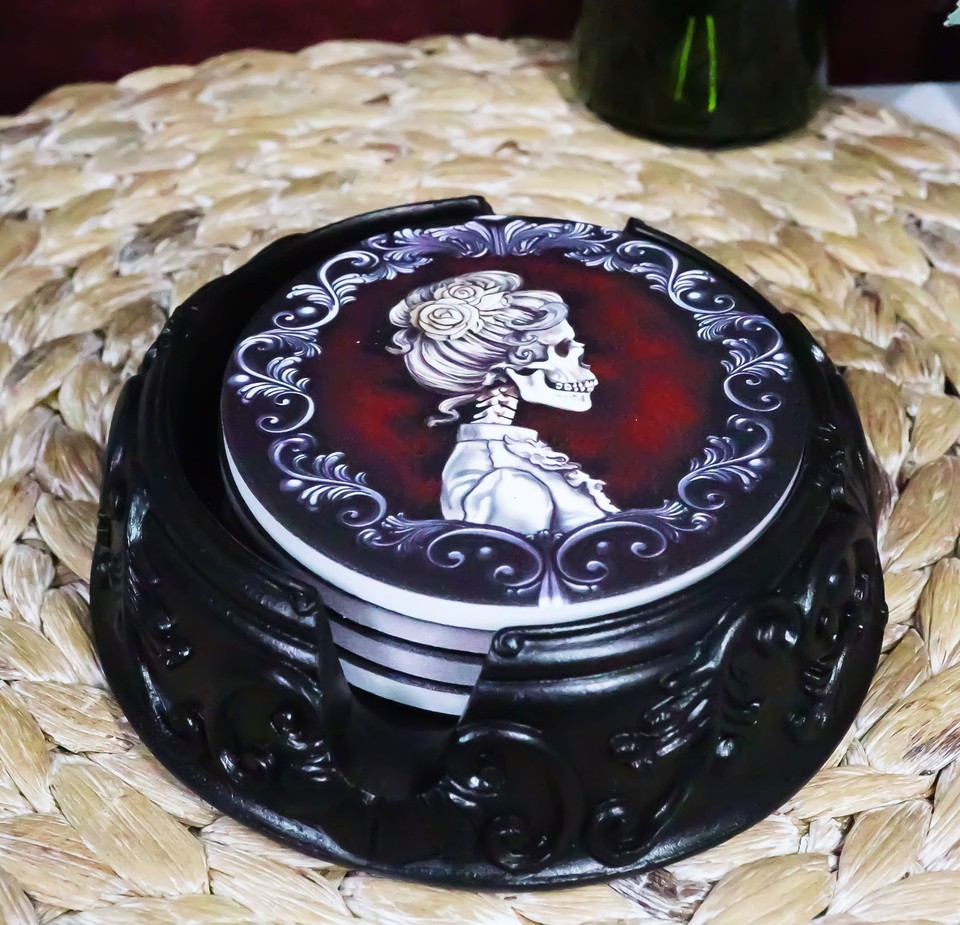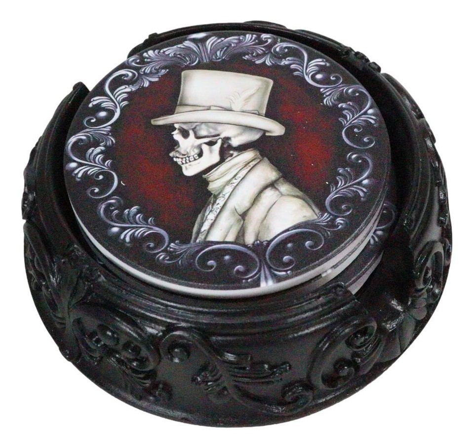 ? Protect your furniture with this skeletal bride and groom coaster set which consists of the floral scroll base holder with 4 round tile coasters. The details on the sculpture is intricate and amazing, making this set a great party centerpiece, home decor, kitchen decor or what have you!