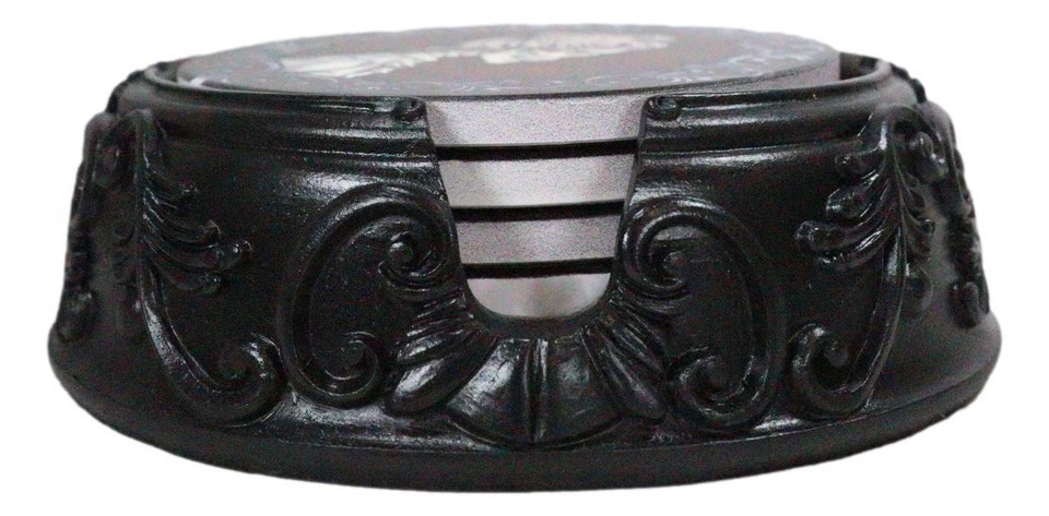 ? You will get the black floral scroll base holder and 4 coasters as pictured. Each coaster is 5" in Diameter.