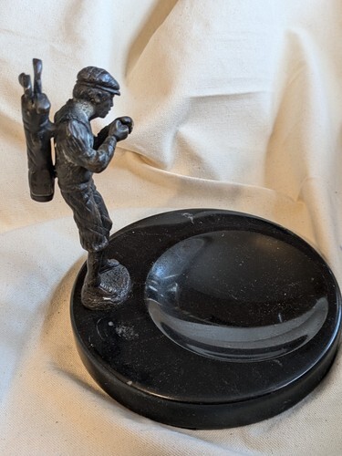 Bronze Golf Golfer Sculpture Black Marble Ashtray Pin Tray 6 in Tall