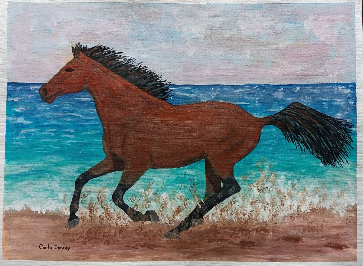This original painting titled "Akhal Teke Horse Galloping On Ocean Beach" is a one-of-a-kind piece of contemporary art by Canadian artist Carla Dancey. The Akhal Teke horse is known for its extraordinary beauty and a unique, almost metallic sheen to its coat. This bay stallion is depicted in a post-impressionist style, with acrylic paint in both matte and metallic finishes on acid-free, no-bleed thick artist's paper. The painting is signed by the artist and comes with a certificate of authenticity.