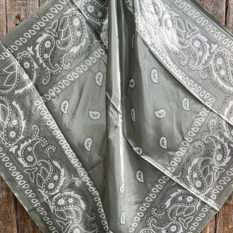Our classic wild rag/scarf in silver sage and white with a simple paisley pattern. It is a square and measures 35" x 35". It is sure to add a bright pop of color to any outfit.