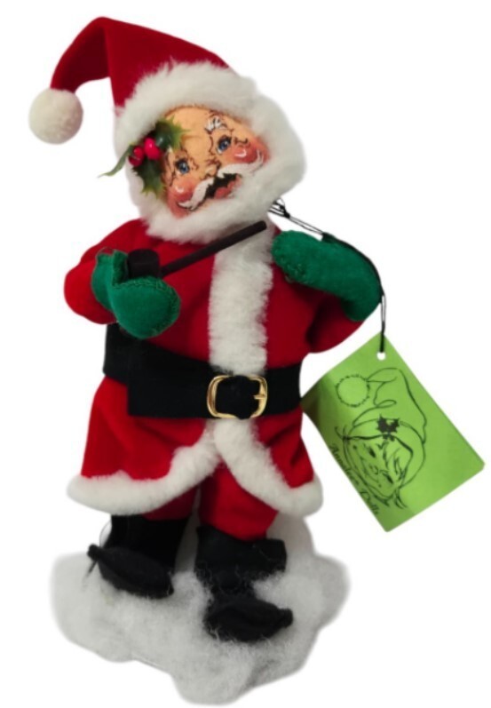 Description: The figure is a Santa Claus doll in a traditional red suit with white fur trim, a black belt with a gold buckle, and green felt mittens. He is holding a black pipe and stands on a white, "snow"-covered base.