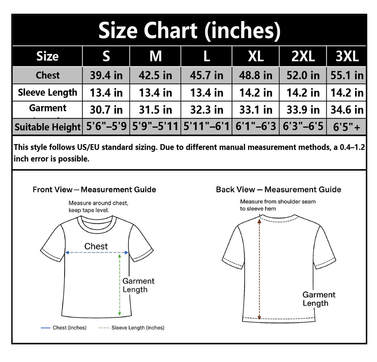 This style follows US/EU standard sizing. Due to different manual measurement methods, a 0.4–1.2 inch error is possible.