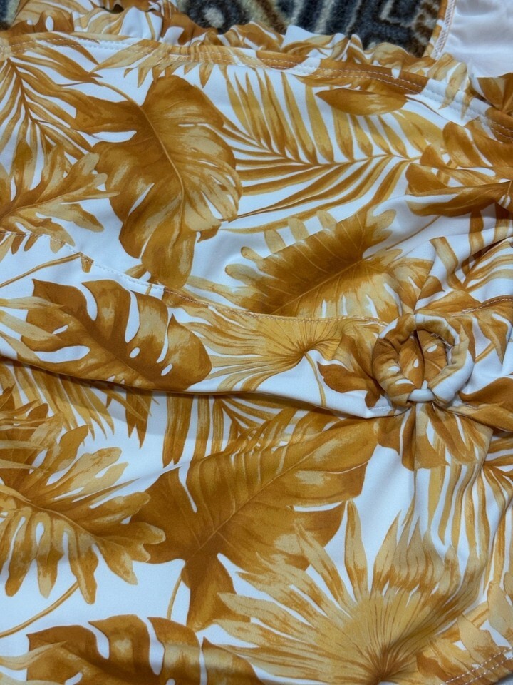 This swimsuit features a ruffled shoulder design and a vibrant tropical leaf print, offering style and comfort for swimming activities.