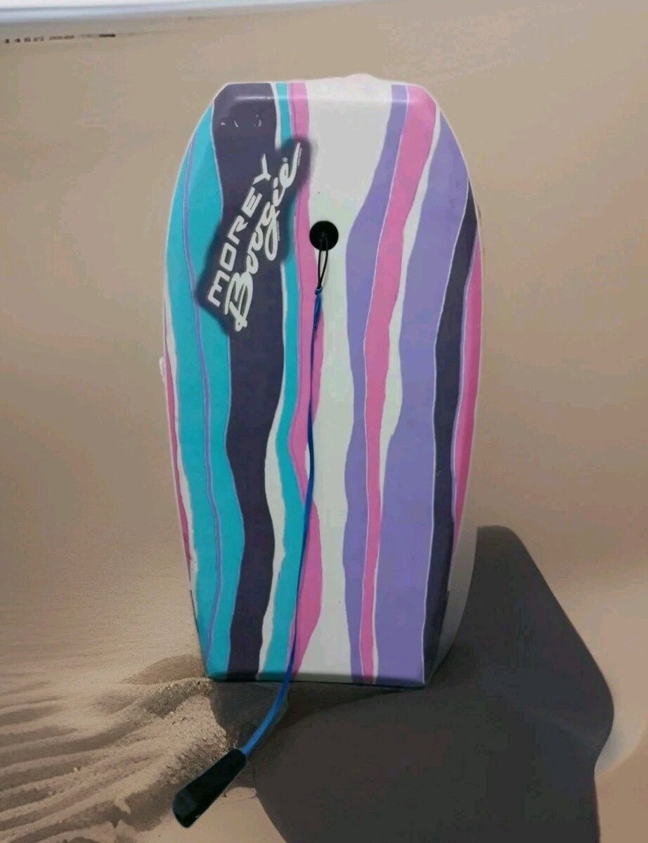 This vintage 1993 Morey Boogie Board Body Board SURF Multi Colored with a Blue Leash is a must-have for any surfing enthusiast.