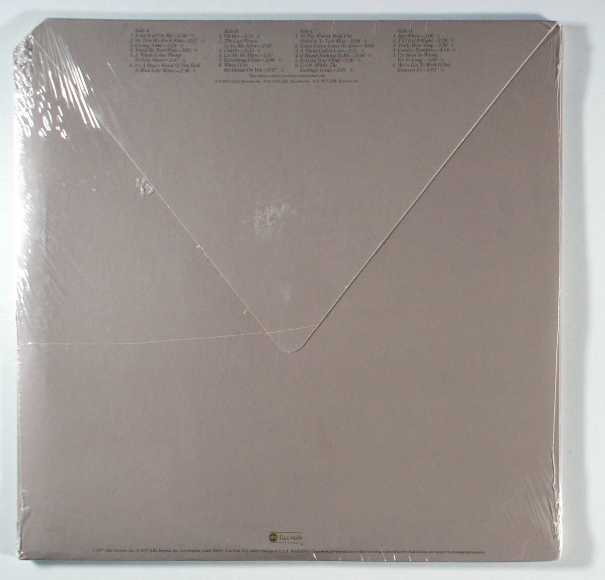 The ABC Collection, by Diana Trask, is a double LP compilation that assembles her standout tracks from her ABC/Dot Records era in the 1970s, highlighting her versatile blend of country, pop, and folk influences with her emotive Australian-accented vocals. A unique aspect is its format as a comprehensive two-disc set, rare for compilations of that period, capturing her trailblazing role as one of the few international artists to crack the U.S. country scene amid the genre's evolving soundscape. Historically significant for preserving her crossover appeal, the album features fan-favorites like the empowering It's A Man's World (If You Had A Man Like Mine), the tender Loving Arms, her bold cover of Stand By Your Man, and the poignant When I Get My Hands On You. Other beloved selections include her signature Lean It All On Me and heartfelt renditions of Let Me Be There and Everything I Own, which showcase her interpretive depth on classics. Treasured by devotees for its nostalgic depth, this collection underscores Trask's enduring legacy in bridging worlds through song.