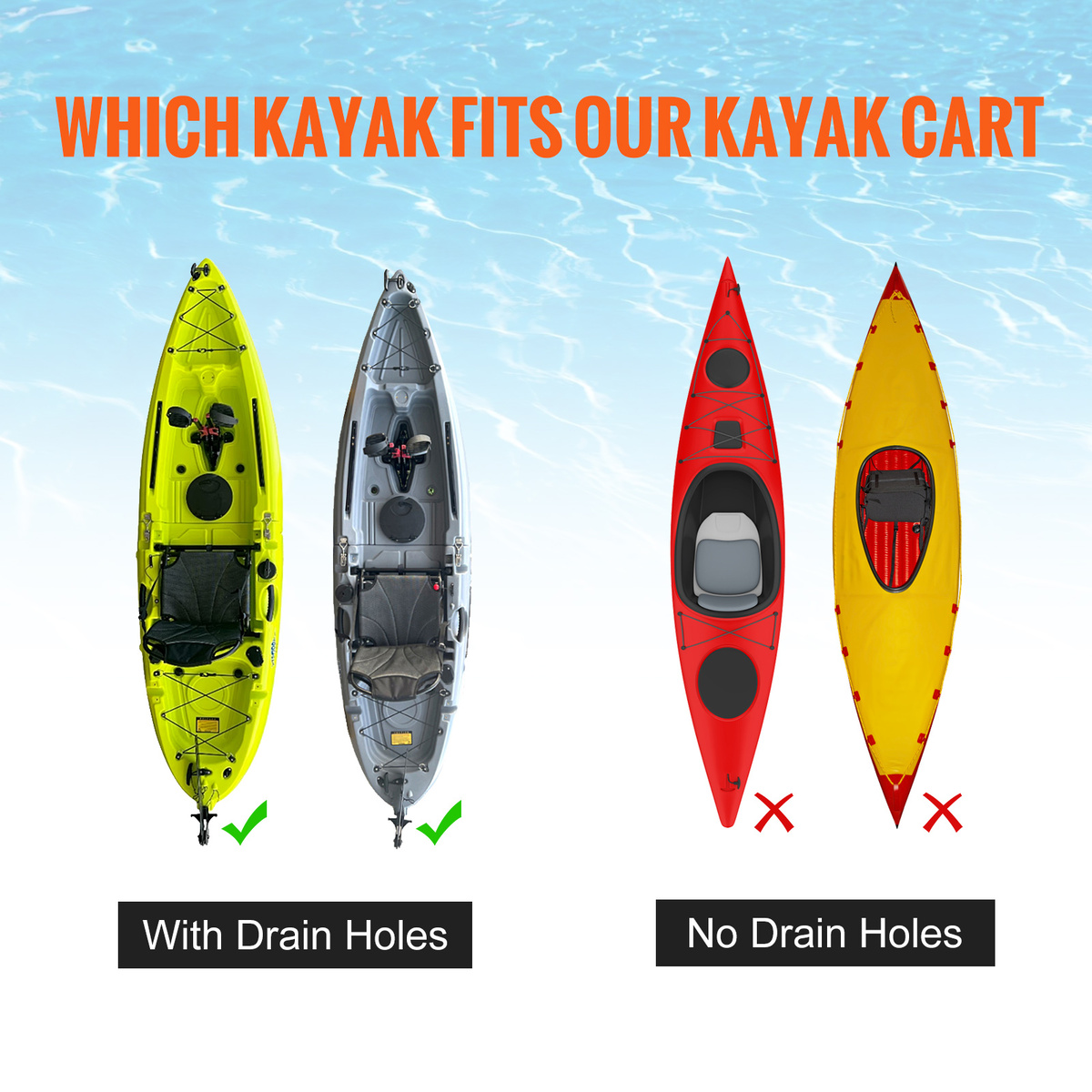 Reinforced Protection: This cart adds foam protection to the top of the support to better fix the bottom of the kayak while safeguarding your kayak drain holes. Even the heavy kayaks can be stable and undamaged.